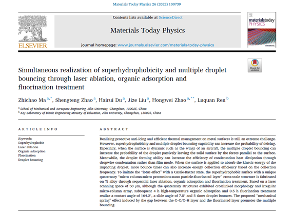 The research was supported by the National Natural Science Foundation of China (51875241) and the Jilin Province Key R&D Plan Project (YDZJ202101ZYTS129). The correlative paper “Simultaneous realization of superhydrophobicity and multiple droplet bouncing through laser ablation, organic adsorption and fluorination treatment” was published in the well-known academic journalMaterials Today Physics. Professor Zhao Hongwei and Professor Ma Zhichao are co-corresponding authors of the paper, and Academician Ren Luquan from the Key Laboratory of Bionic Engineering, Ministry of Education, gave theoretical guidance. Professor Ma Zhichao is the first author of the paper.