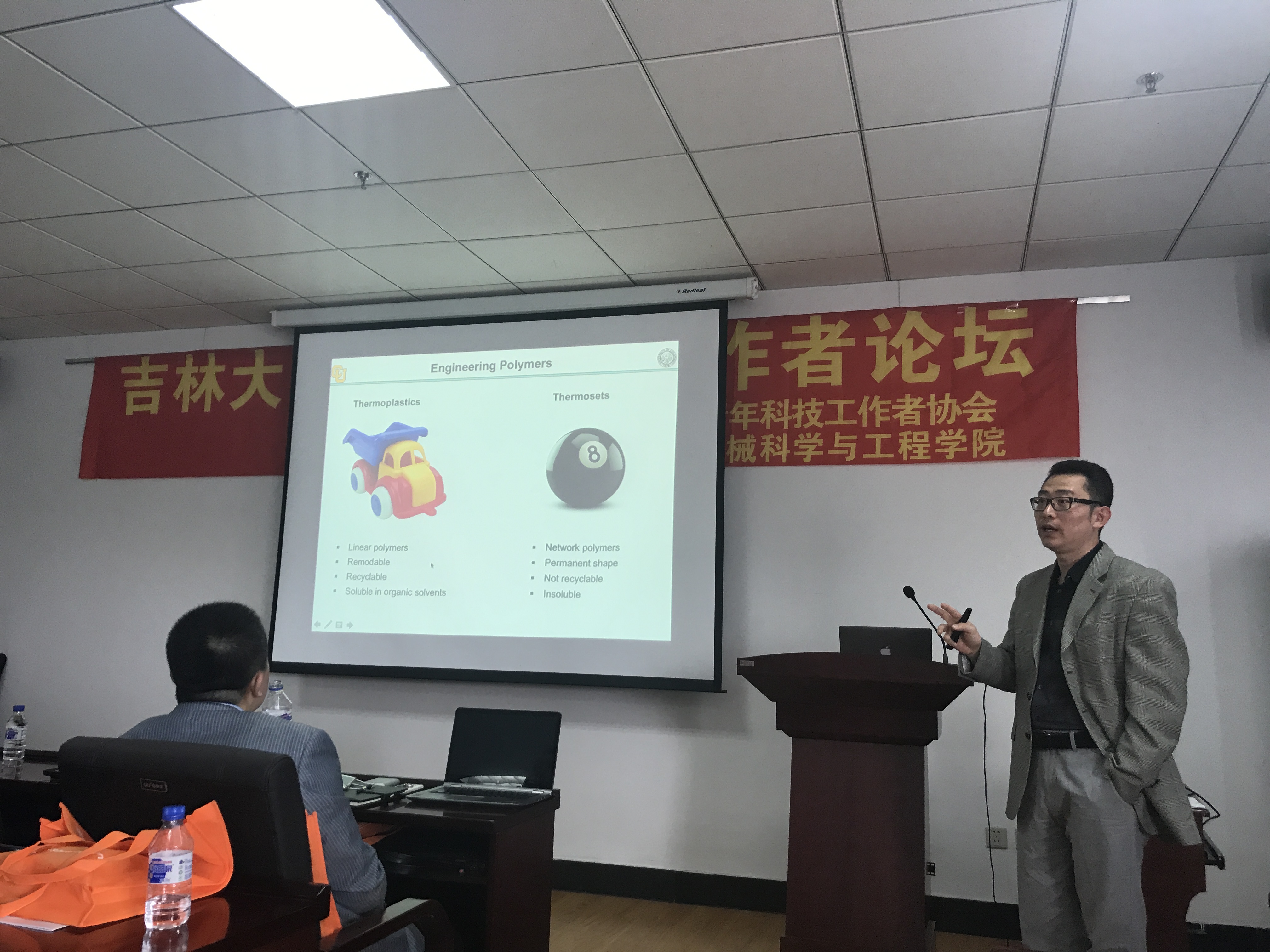 论坛邀请了汽车工程公司副经理闵海涛教授、工程仿生国家地方联合工程实验室常务副主任刘振宁教授、美国科罗拉多大学(Boulder分校)张伟教授和bevictor伟德副经理王继新教授分别作了“面向汽车专业人才培养和学科发展的产学研协同创新实践与思考”、“三维多孔复合电极材料的可控构筑及其能量存储”、“基于结构和功能仿生的无机纳米材料”、“Repairable and Recyclable Functional Composites Enabled by Novel Dynamic Covalent Polymers”和“如何利用交叉学科开展机械工程领域的科研”等五个学术报告。