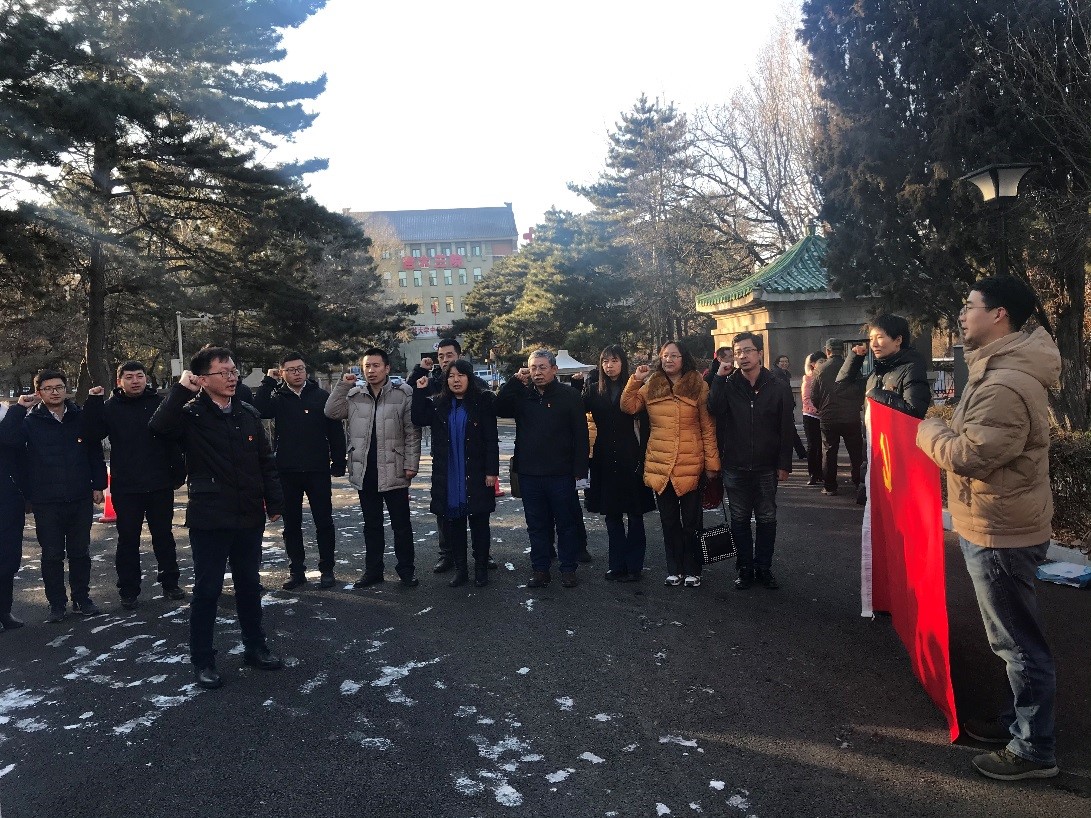 参观结束后,机械制造及自动化系教工党支部联合其他教工党支部在白求恩雕像前开展了“不忘初心,重温入党誓词”活动。在庄严的党旗下,党员同志们心潮澎湃,热血沸腾,仿佛又回到了入党的那一神圣时刻,更加坚定了永远跟党走的信念。
