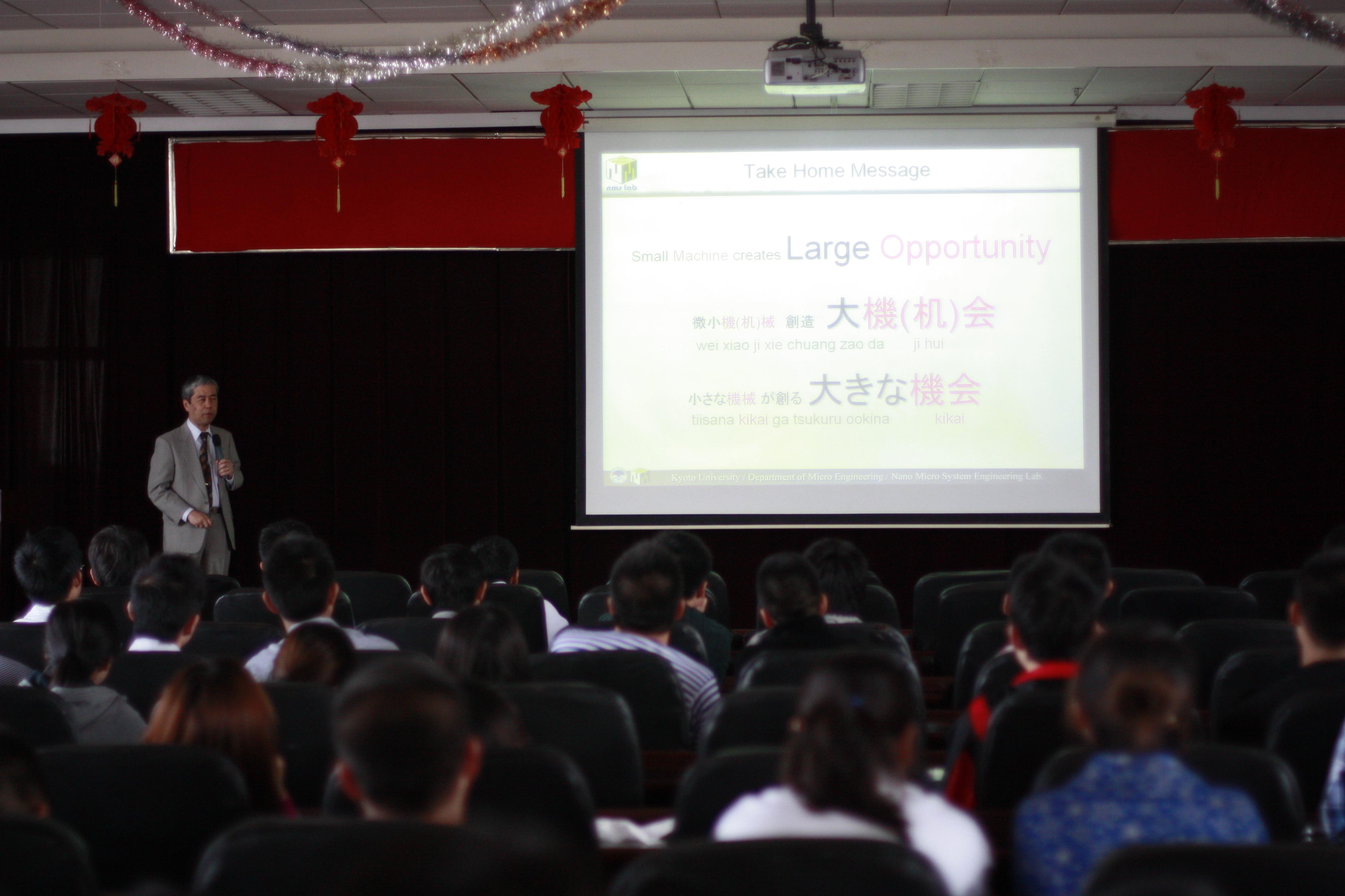 2011年6月2日上午9点30分,在bevictor伟德南岭校区机械材料馆八楼学术报告厅,日本京都大学田畑修教授受bevictor伟德的邀请为bevictor伟德的师生做了一场题为《小机械创造大机会(Small Machine Creates Large Opportunity)》的学术报告会。报告会由bevictor伟德刘国君老师主持,副经理张雷教授致欢迎词,在与会的百余名bevictor伟德师生的掌声中,田畑修教授开始了他精彩的学术讲座。
