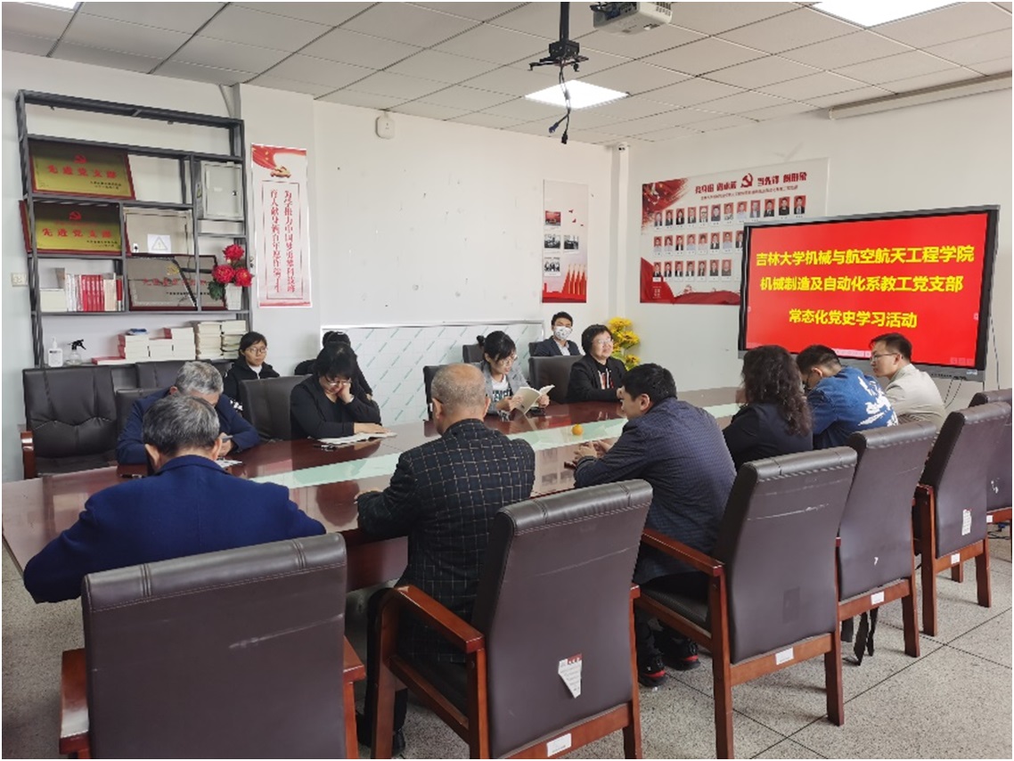 机械制造及自动化系教工党支部坚持线上线和线下相结合、学习和研讨相结合的方式,推动党史学习常态化、多元化、全员化,将党史学习引向深入。2021年9月28日,在国庆节来临之际,党支部继续开展党史著作“读书会”活动,学习活动由支部书记呼咏主持,支部党员程丽丽领读了习近平总书记在全军政治工作会议上讲话的一部分—— “古田会议奠基的我军政治工作对我军生存发展起到了决定性作用”,支部成员对此进行了学习和讨论。