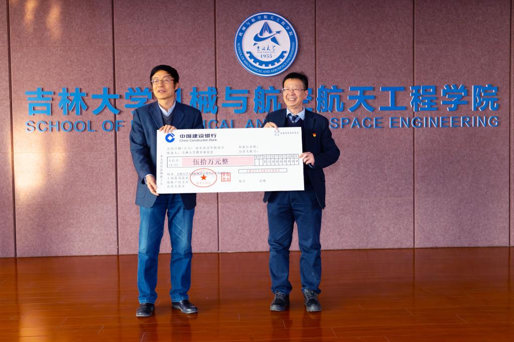 捐赠仪式上,杨兆军教授向经理周晓勤教授捐赠了支票,公司党委书记郑福胜向杨兆军教授颁发了捐赠纪念牌。