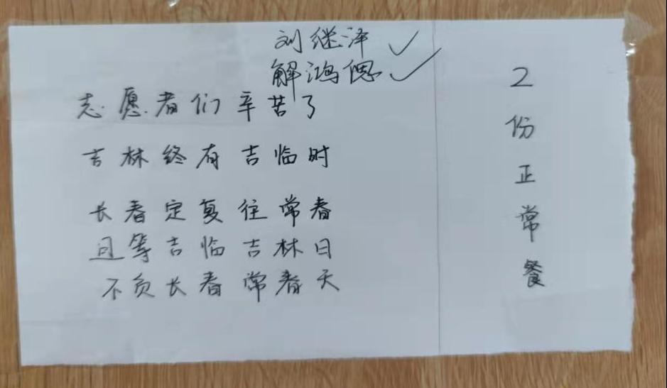 其实因为疫情突然,刚封寝时公寓的志愿者并不多,只有老师和我们12名同学,需要配送234个人的晚餐和水。说不累不躁是假的,但群里同学们的谢谢和理解,真的让人很感动,继续做好自己能做的事。当然在吉大这座校园里,同行者永远不会少,同寝的室友们都加入到送饭的队伍中,不到一天的时间,有将近整栋楼三分之一的同学都报名了志愿者。