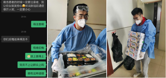 自从疫情爆发以来,作为一名预备党员,总想着为自己的母校做些力所能及的事情,一起挺过这个难关。公司组织志愿者团队,我报名并顺利成为其中的一员。因为疫情期间禁止出楼、出寝室活动。作为8公寓志愿者之一的我,负责的是楼层间同学们每天三餐的配送、饮用水和防疫物资的发放、餐余垃圾的处理。看到同学们拿到物资时脸上洋溢的幸福,这一刻我觉着我的工作虽小但非常有意义。我坚信,通过大家的共同努力,一定能打赢这场疫情防控阻击战。