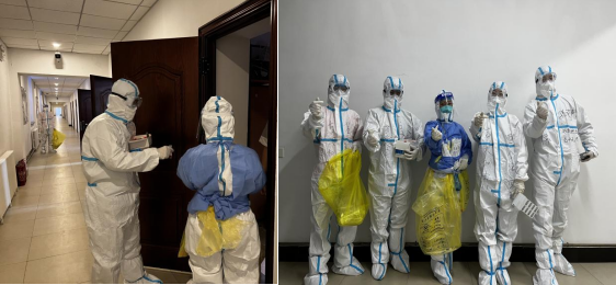 随着疫情的加剧,核酸检测频率也随之增加,医护人员明显人手不够,因此我们摇身一变,变成了大家熟悉的“大白”,几个充了气捂得严严实实的大白每天下午活跃在4公寓。“大白”确实不是那么好穿的,闷热先不说,只要一说话,防护眼镜里就起雾了。但比起外来的医护人员,我们只穿两个小时,她们却要穿一整天,实在是很辛苦。当然,检测过程也会有一些小插曲,穿着“大白”站在你认识的人面前,只要不说话,他就不会认出你来,真是难得的一段记忆。