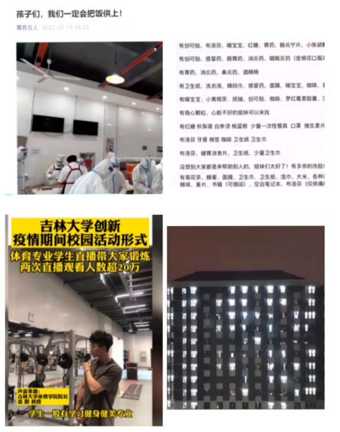 “孩子们,我们一定把饭供上!”于是在第二天清晨,我们足不出户便能收到热气腾腾的早餐,能喝到分量充足的矿泉水,能闻到新鲜水果的香气,一切充足的物资保障让我们觉得适应又不适应,你能在各种社交媒体上毫不费力的找到击中你内心的“那个点”。此刻,对吉大学子来说,bevictor伟德四个字就像是定海神针一样的存在。物资互助文档、健身线上直播、正能量短视频、夜幕下的校园大合唱,吉大学子也同样用自身行动践行着疫情当前团结一心的“吉大精神”,留下了属于我们自己的精神文化符号。