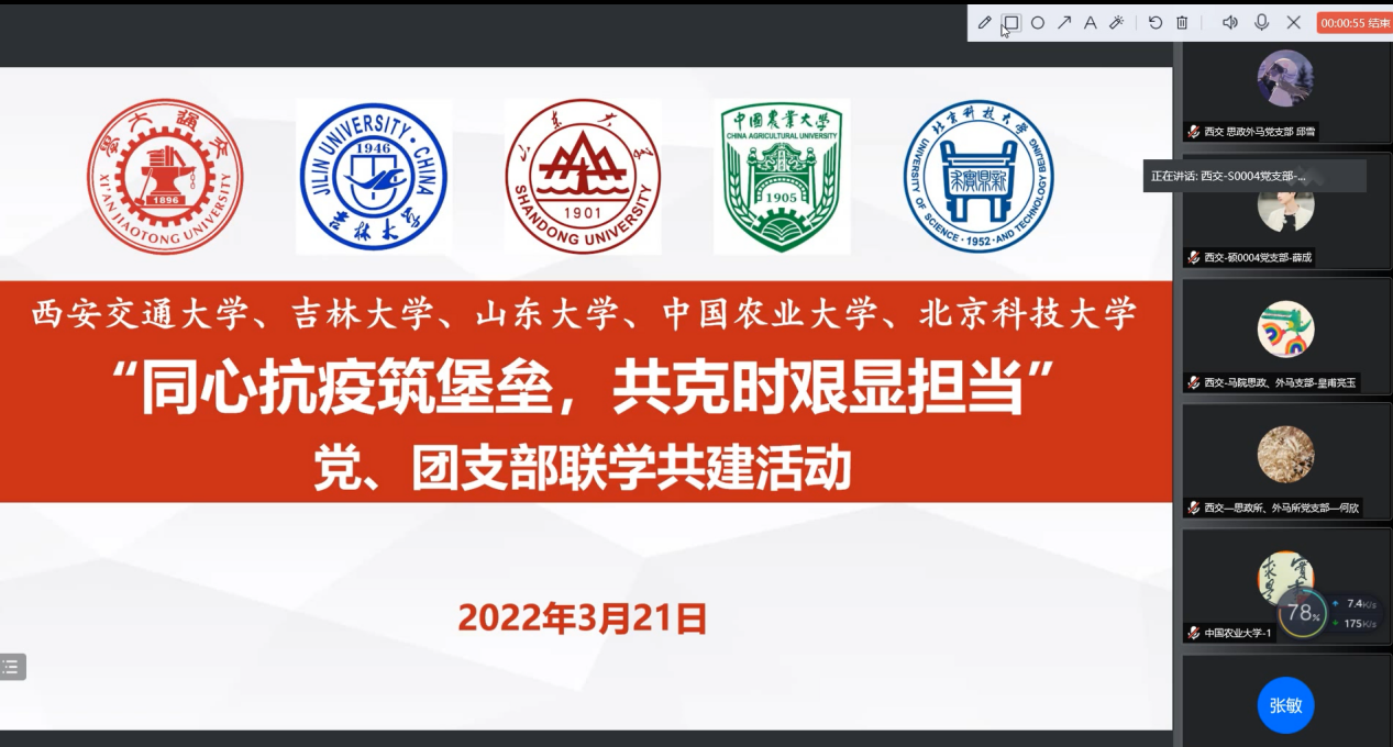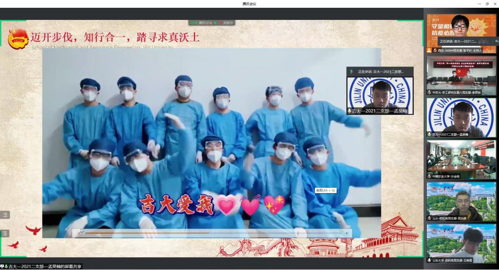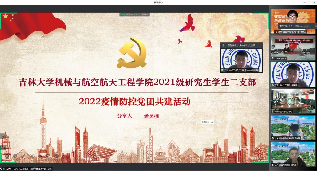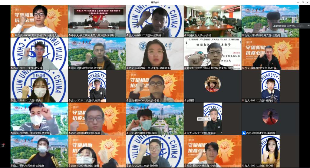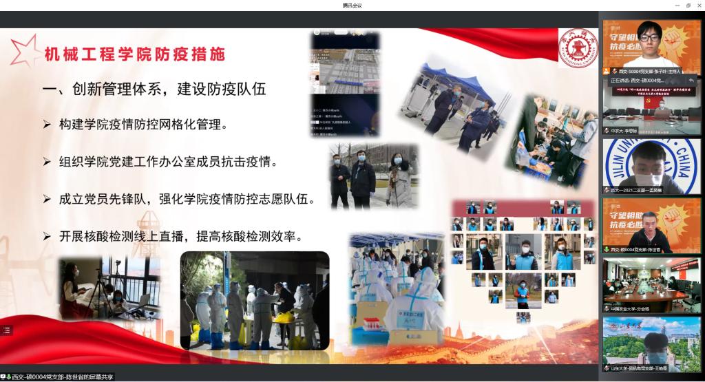西安交通大学机械工程公司党委副书记张敏致辞,理性地分析了当前的疫情形势,呼吁各高公司党团支部充分发挥自身基层堡垒作用,切实把思想和行动统一到党中央、国务院决策部署上来。西安交通大学郭子娜同学传达了习近平总书记关于疫情防控工作重要指示批示精神以及孙春兰副总理调研指导西安疫情防控工作情况,号召各高公司党团支部严格响应国家各项防疫政策,在疫情防控工作中积极发挥桥梁纽带作用。随后bevictor伟德、山东大学、中国农业大学及北京科技大学各支部代表分别就各自公司疫情形势、应对的措施及面临的问题详细阐述,旨在通过经验分享让各高校集思广益,博采众长,更好地结合实际情况开展更有效的防疫措施。