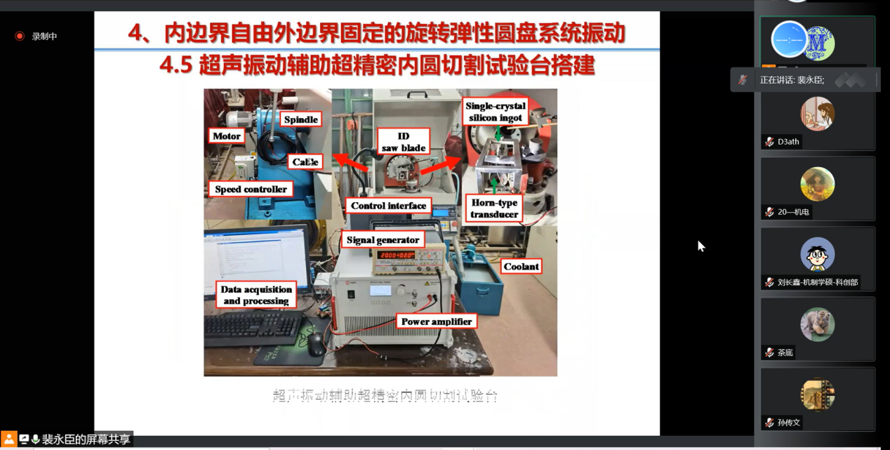裴永臣首先从高速旋转圆盘出发,引出了高速旋转弹性圆盘系统机械震动基础共性问题的研究,就“不同边界条件下的旋转弹性圆盘系统动力学”,“内边界固定外边界自由的旋转弹性圆盘系统动力学”,“内外边界均固定的旋转弹性圆盘系统动力学”,“内边界自由外边界固定的旋转弹性圆盘系统动力学”四个方面一一展开详细讲解。裴永臣为同学们讲解了主轴温升作用下的高速旋转圆盘动力学,从动力学方程和影响因素出发具体分析高速旋转圆盘性能问题;介绍了高速旋转微圆盘双向弹性全耦合的动力学模型;分享了团队开展的高速旋转圆盘研究的实验,并通过有限元的分析和仿真进行实验改进;展示了团队自研发和设计的超声震动辅助超精密内圆切割试验台。报告结束后,同学们与裴永臣教授就相关问题进行了深入探讨,裴永臣教授耐心解答、悉心指导,并欢迎有疑问的同学随时进行交流、讨论。