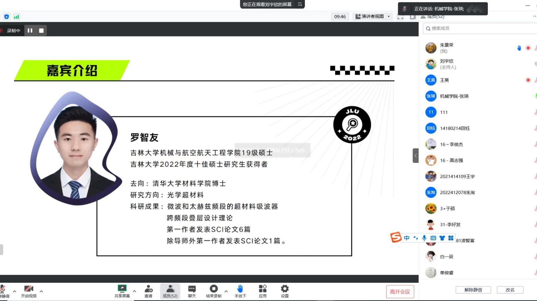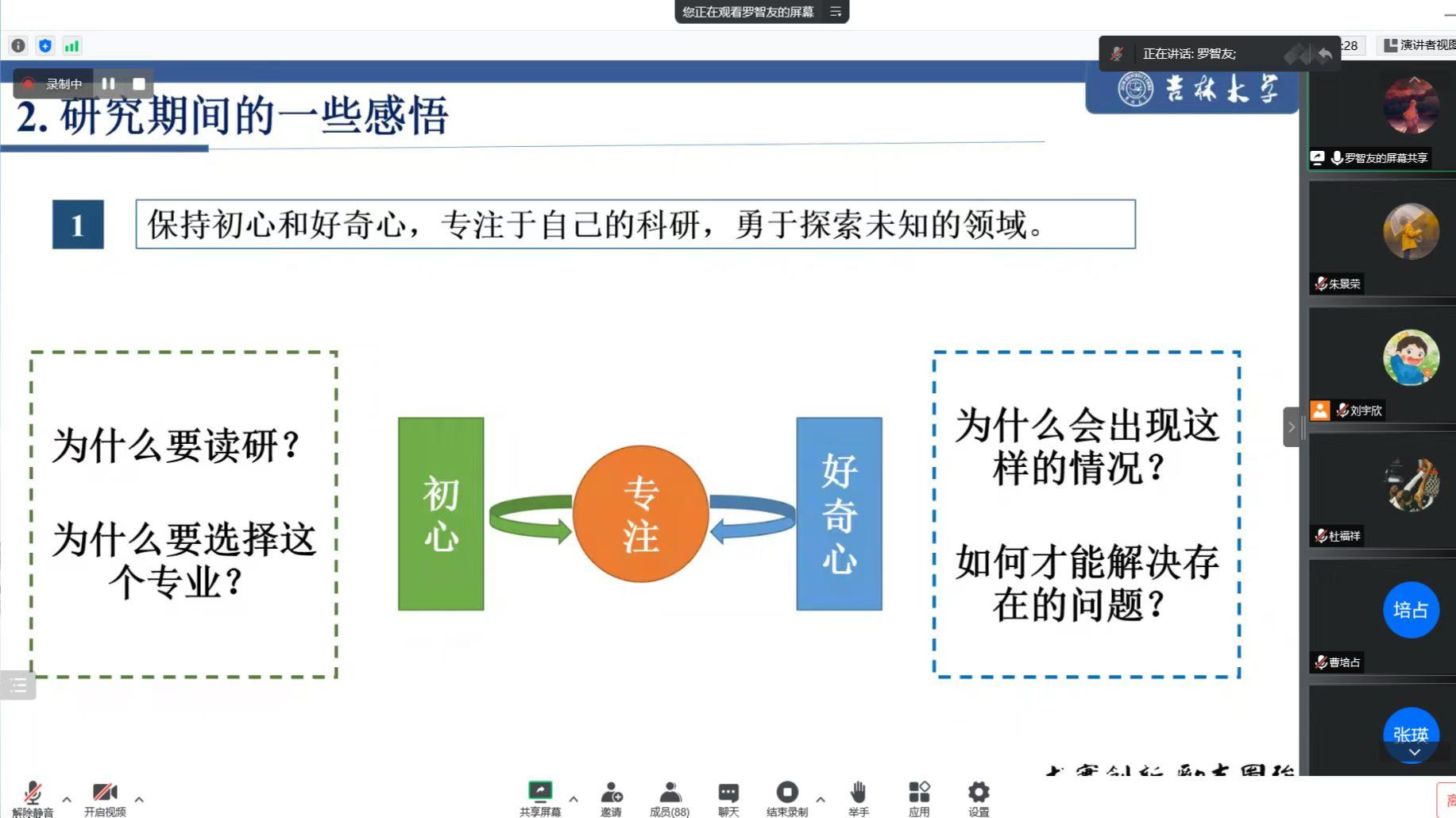 为提升公司新入学研究生的科研素养,引导其做好科研规划,帮助同学们迅速进入科研状态,2022年9月3日上午,bevictor伟德通过线上会议开展“研途有你,创领未来”系列讲座第一期——“佳”期有约。本次讲座邀请到2022年bevictor伟德十佳硕士研究生罗智友,与同学们分享硕士期间的科研经验。
