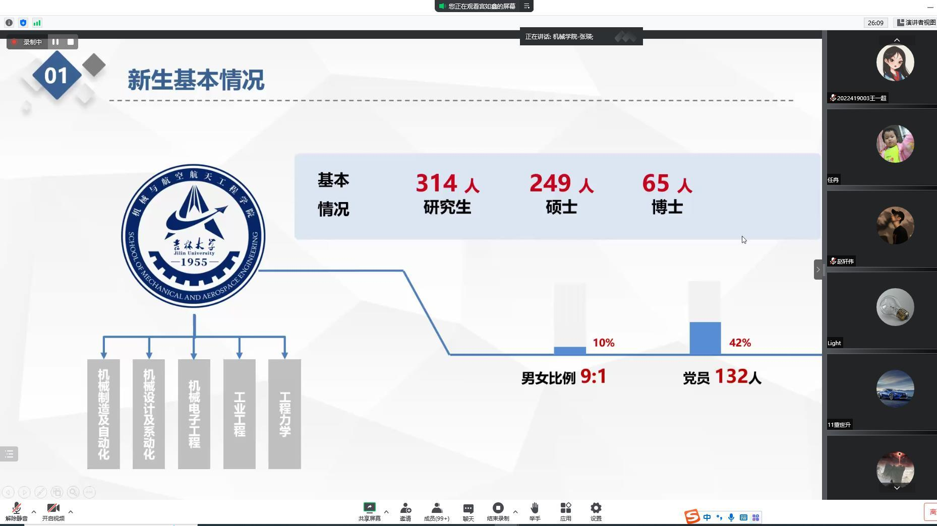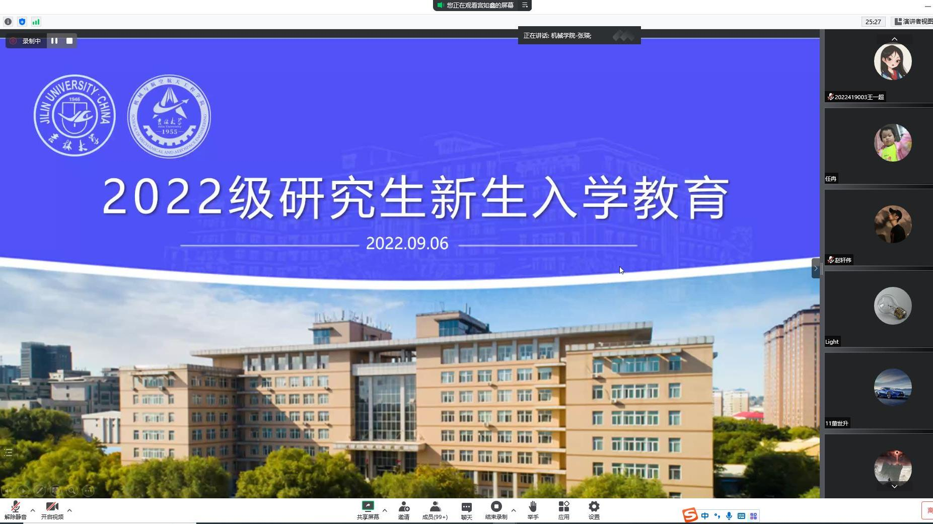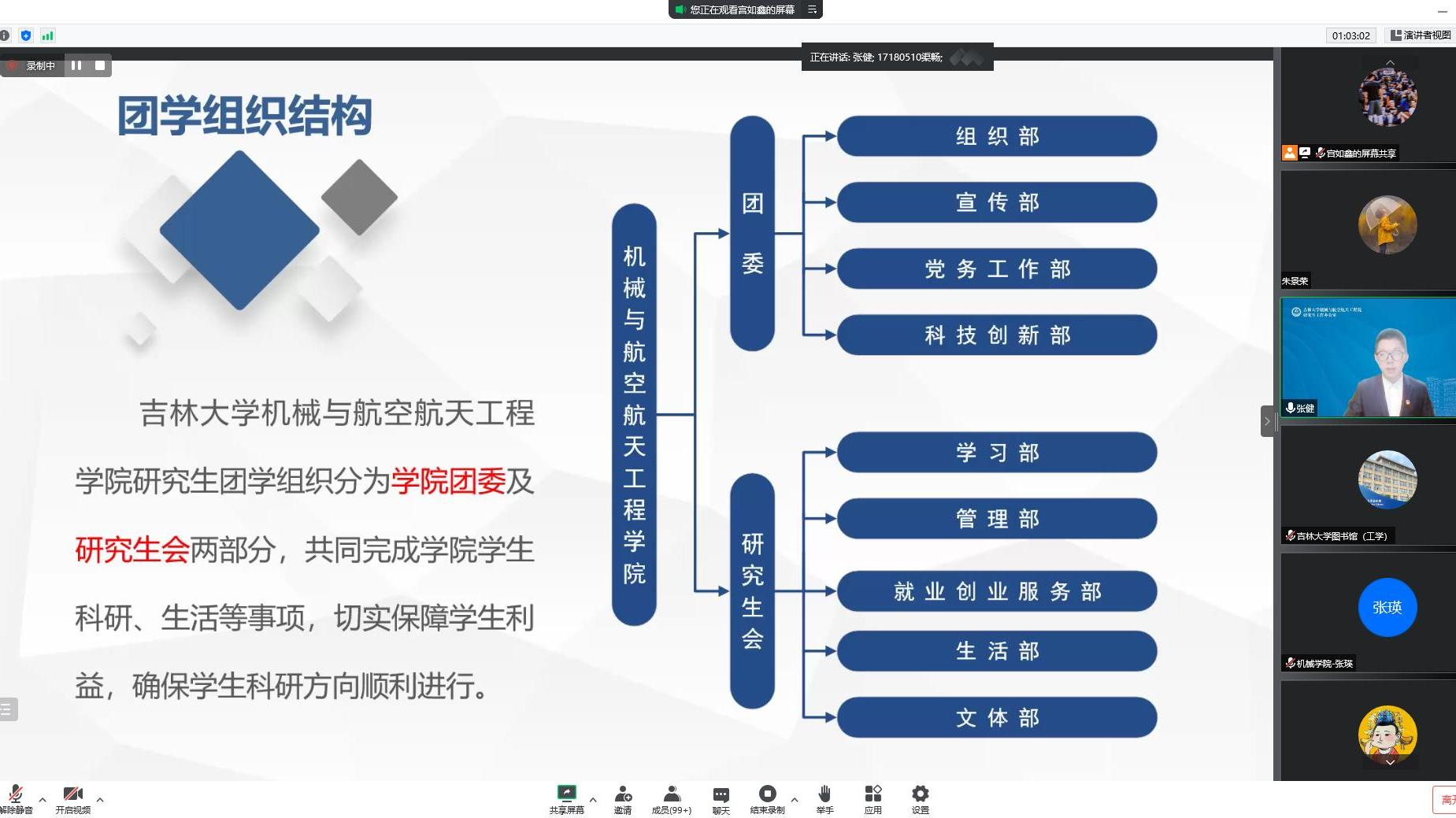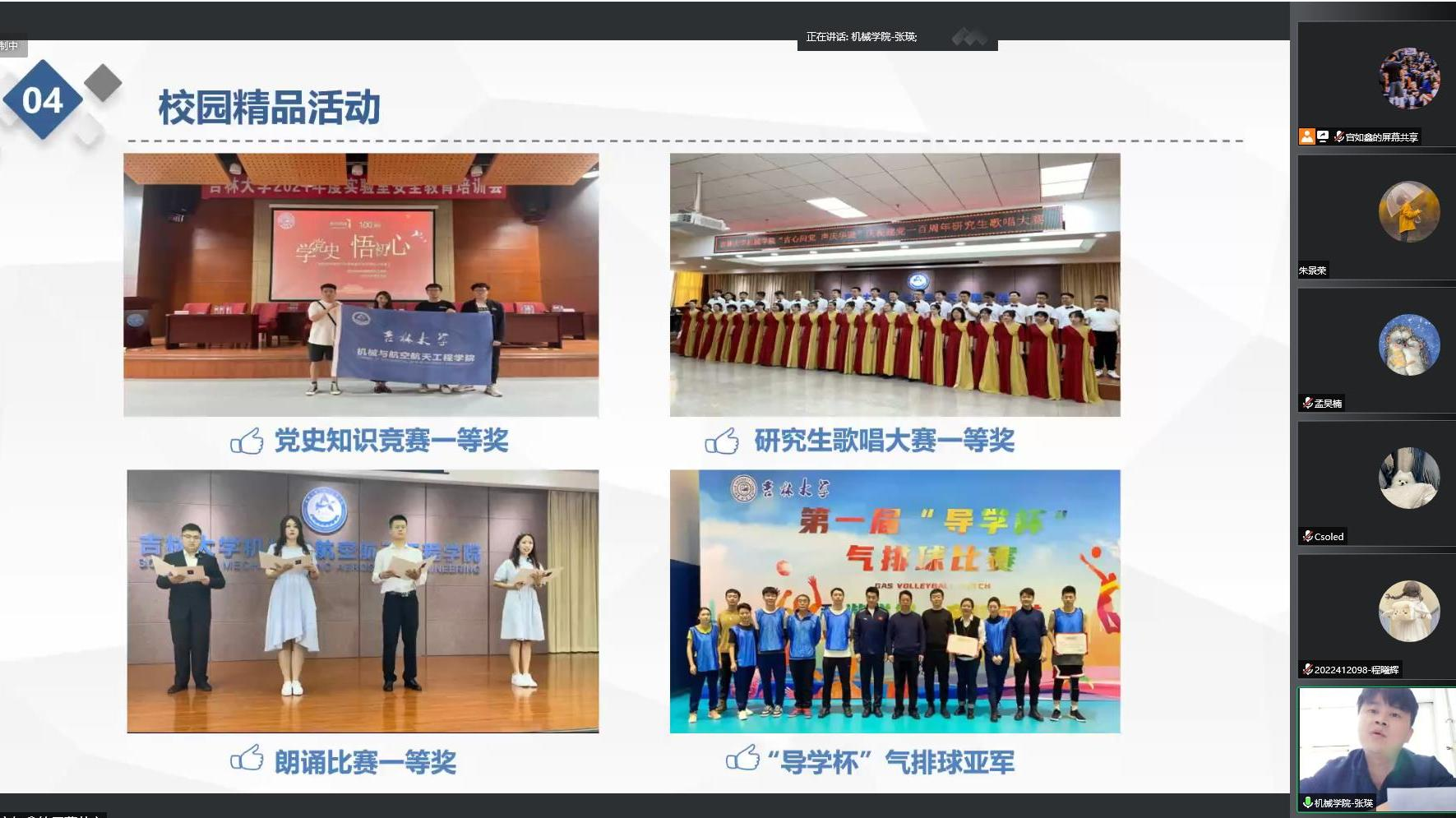 会议开始,辅导员张瑛代表公司表达了对2022级全体研究生的热烈欢迎,并播放《2022年长春城市形象宣传片》和《吉大力量》两部短片帮助新同学认识新环境,打破陌生感,增强认同感。接着向研究生们介绍了本届新生基本情况,介绍了研究生管理办公室和公司产品办公室的主要职能以及相关老师的责任分工,强调研究生导师是公司产品的第一责任人。期间与大家分享了校内常用网址,如电子校务平台、网上办事大厅、公司官网等,帮助同学们尽快熟悉校内办事流程。着重强调疫情常态化防控下要配合公司工作,按照有关要求进行核酸检测,注意寝室卫生和安全,禁止使用违章电器,杜绝一切安全隐患,要警惕校园网络电信诈骗,同时下载反诈骗APP。最后,张瑛向新生们介绍了公司举办的精品系列活动以及研究生就业情况,让同学们认识到一个有趣活跃、专业进取的公司,同时向同学们表达期许,希望同学们在未来三年学业里,不负韶华,以梦为马,不忘初心,顺利毕业。