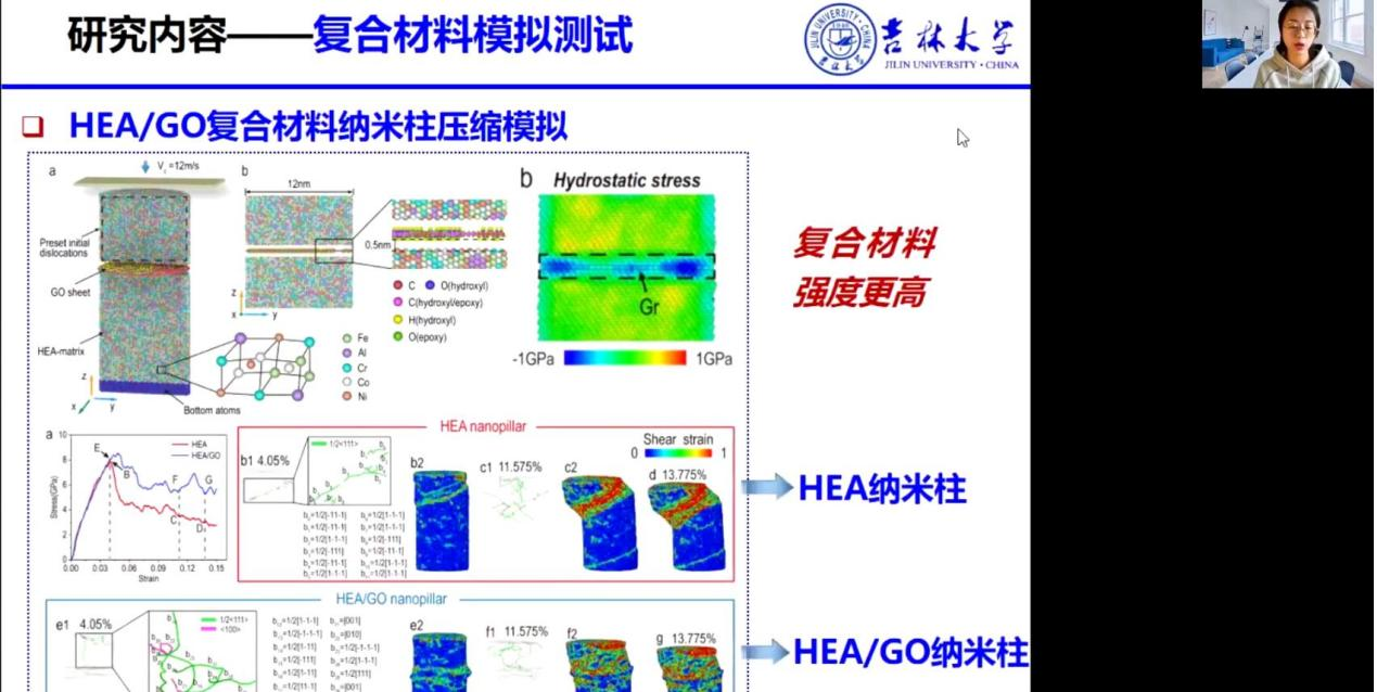 张微从国内外研究背景出发,结合高熵合金在生产生活中存在的实际问题,强调了基于原位测试的高熵合金微纳米尺度结构与性能研究的必要性。主要研究包括:在柱态的高熵合金样品上进行一系列轧制和热处理工艺,通过不断调整优化参数使材料塑性和强度都有所提高,打破了传统工艺塑性强度难以平衡的问题。尝试在柱态高熵合金基体中掺入氧化石墨烯纳米薄片进一步改善材料的力学特性,测试结果表明复合材料硬度均高于初始高熵合金,并随着氧化石墨烯含量的增加材料硬度也有所提升。随后利用EBSD获得晶粒尺寸,发现随GO含量增加,晶粒尺寸减小,并在0.6wt%达到最小,晶体无择优取向。此项实验得到的复合材料性能更优,对机械结构关键零件耐用性能提升具有重要意义。报告结束后,同学们与张微师姐就相关问题进行了深入探讨。