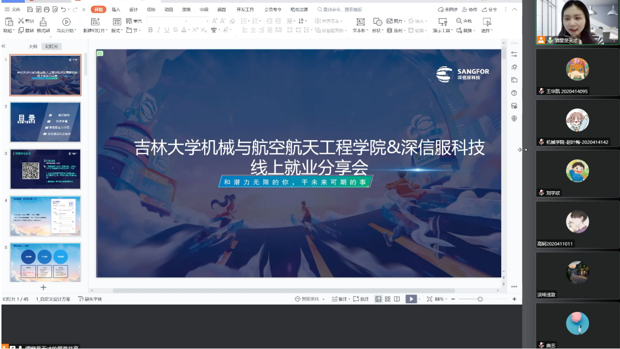 为提高公司就业服务质量,助力公司毕业年级研究生了解就业形势,提升就业技能,2022年9月20日,bevictor伟德通过腾讯会议线上开展了“‘云’上求职,逆风起航”就业系列讲座第四期。本期讲座由研究生辅导员曲艺和深信服科技公司的校招负责人翁洁玲主讲,2020级全体研究生参加了本期讲座。