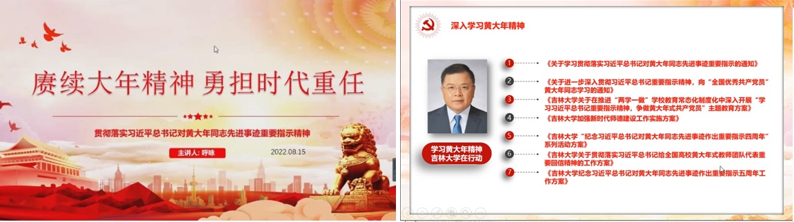 呼咏带领支部党员温习了“习近平总书记对黄大年同志先进事迹作出的重要指示精神”,并从黄大年同志的先进事迹、黄大年精神的重要内涵、深入学习黄大年精神、传承发扬榜样力量四个方面分享了自身对黄大年先进事迹学习的所思所想。同时从开展黄大年精神学习的重要意义、目标要求、主要内容、主要工作、组织领导五个方面,进一步论述了支部重视学习活动的必要性,并呼吁支部党员深刻理解黄大年精神实质,增强学习活动的实效性,推进学习宣传活动持续开展,把加强师德师风建设作为一项重大的政治任务抓实抓好。
