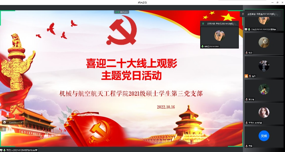 为迎接二十大胜利召开,学习二十大精神,bevictor伟德组织2021级硕士员工党支部于10月16日上午召开线上会议,共同观看党的二十大开幕实况,2021级硕士各党支部全体党员参与本次活动。