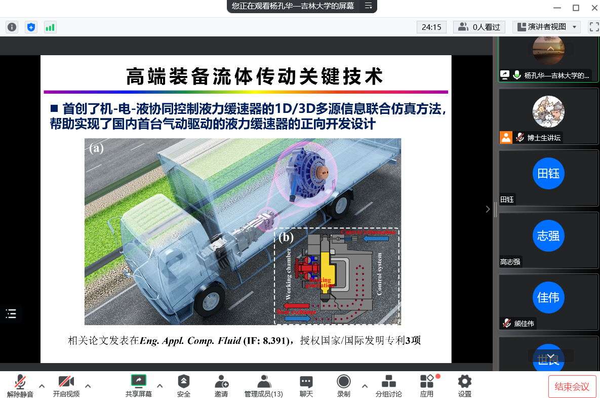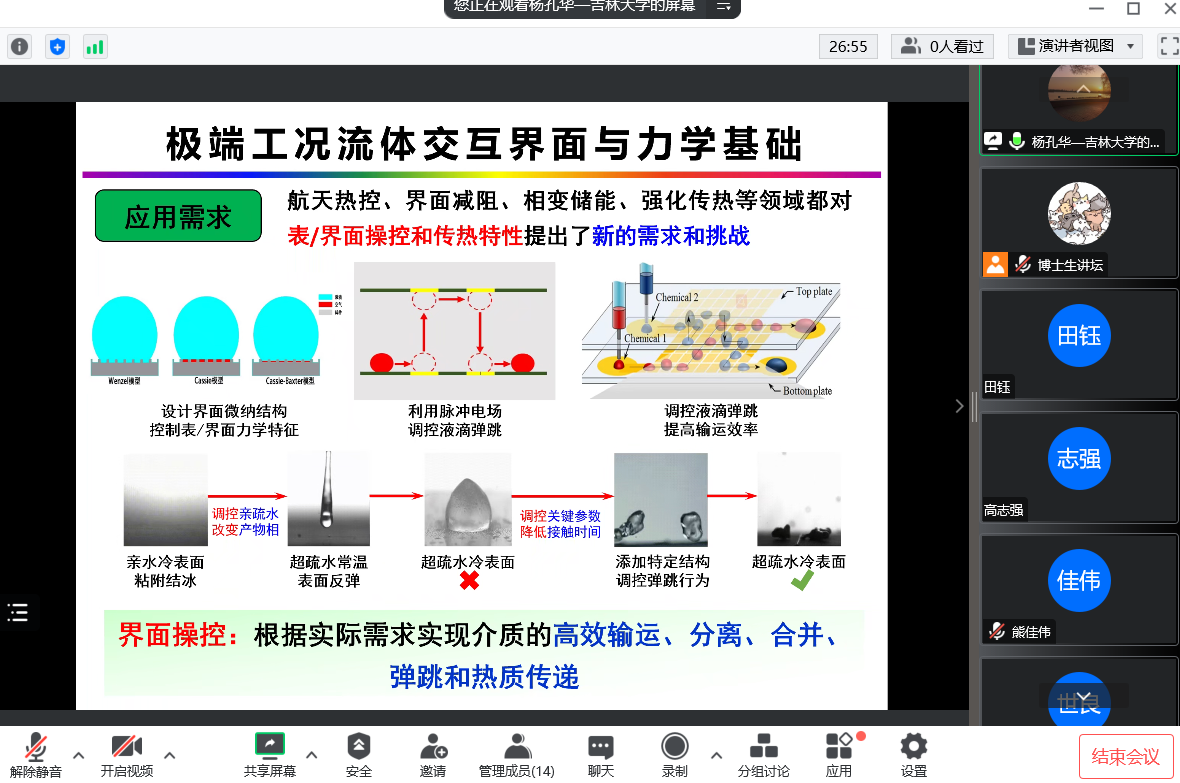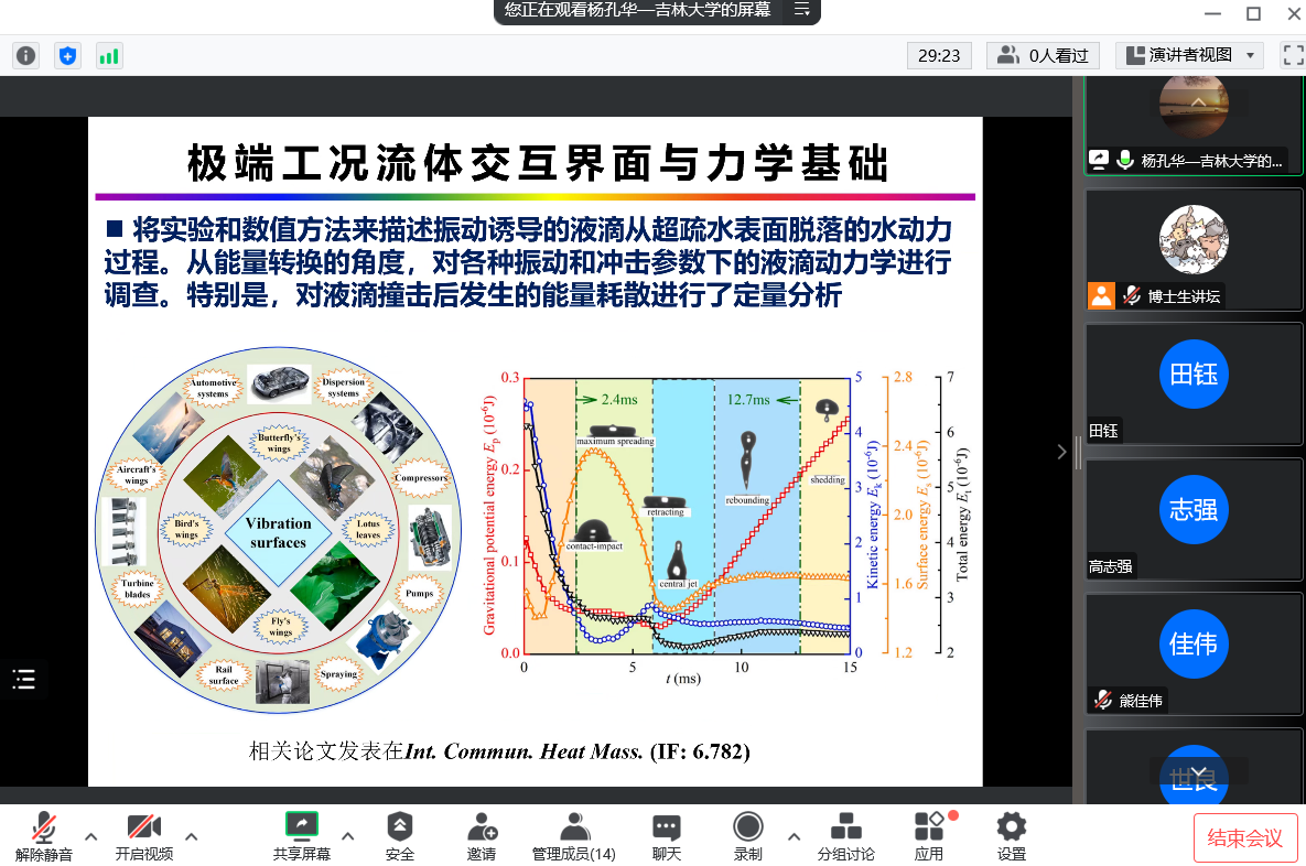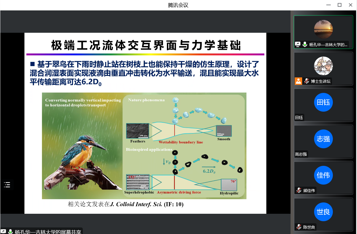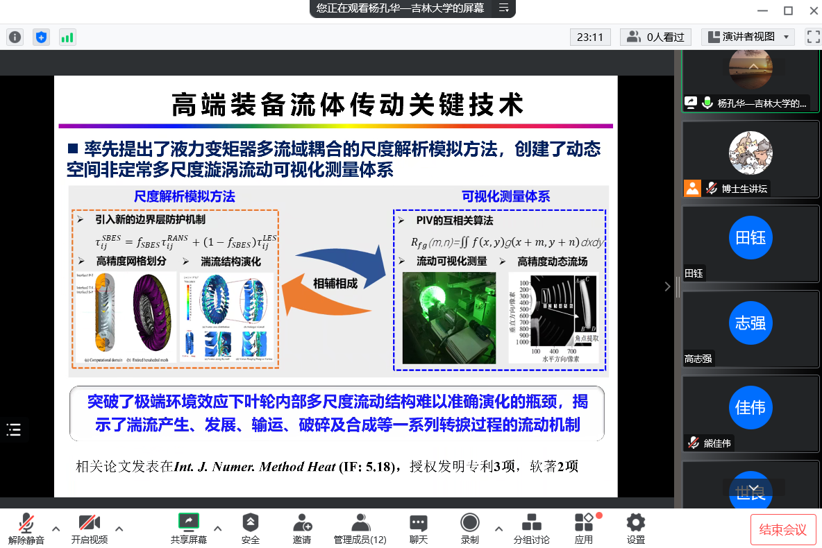杨孔华就当前研究内容进行介绍。团队通过液力变矩器叶栅与结构设计、低耗排动力动态匹配、叶片与叶轮制造等核心技术的攻关一定程度上解决了液力传动存在的“四难”等问题。率先提出了液力变矩器多流域耦合的尺度解析模拟方法,创建了动态空间非定常多尺度漩涡流动可视化测量体系,突破了极端环境效应下叶轮内部多尺度流动结构难以准确演化的瓶颈,揭示了湍流产生、发展、输运、破碎及合成等一系列转捩过程的流动机制。在极端工况流体交互界面的研究,通过复制自然界叶片表面的超疏水性制备具有微纳结构的表面,接触角和空化结构共同作用下影响界面传热和表面粘附力,从而实现防结冰应用。在科研经验方面,杨孔华就如何在有限时间内得到更好的成果的问题向同学们传授相关经验,会后同学们表示受益匪浅。