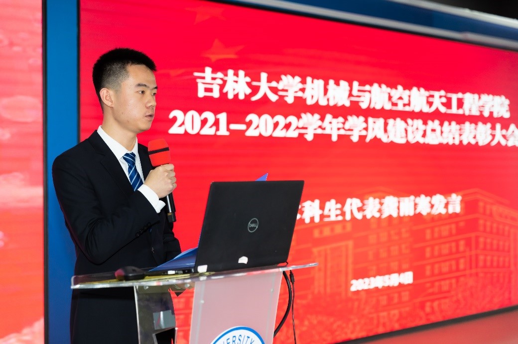 获奖员工代表、“院十佳老员工获得者”龚雨寒发言。他总结与分享了他的大学四年生活,并向辛勤工作的教师们致以最诚挚的感谢。他呼吁每一名同学秉承“朴实厚重 追求卓越”的院训精神,脚踏实地,厚积薄发,在时代浪潮里砥砺向前。