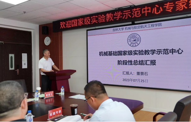 机械基础教学中心副主任董景石围绕实验室管理与运行机制、教学与人才培养、教学改革与研究、教学条件保障、教学团队建设、示范引领成效、特色亮点与创新等方面向专家组介绍了实验室的建设情况。