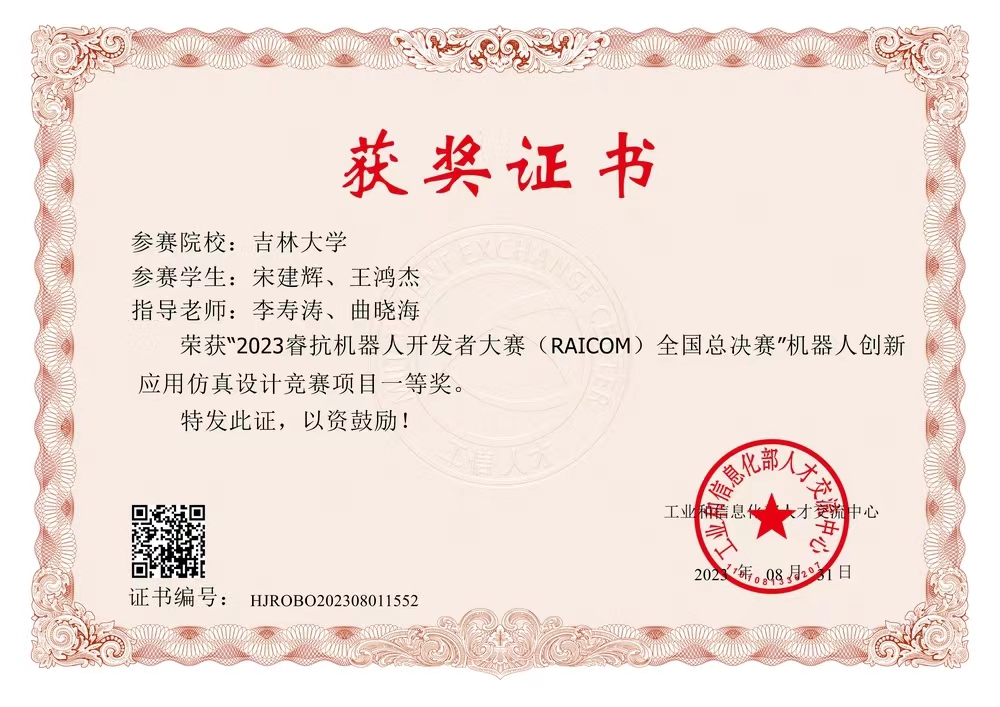 在工程创客赛道(CAIM)机器人创新应用仿真设计赛项中,由李寿涛老师及中心教师曲晓海指导的宋建辉、王鸿杰勇夺国家一等奖。