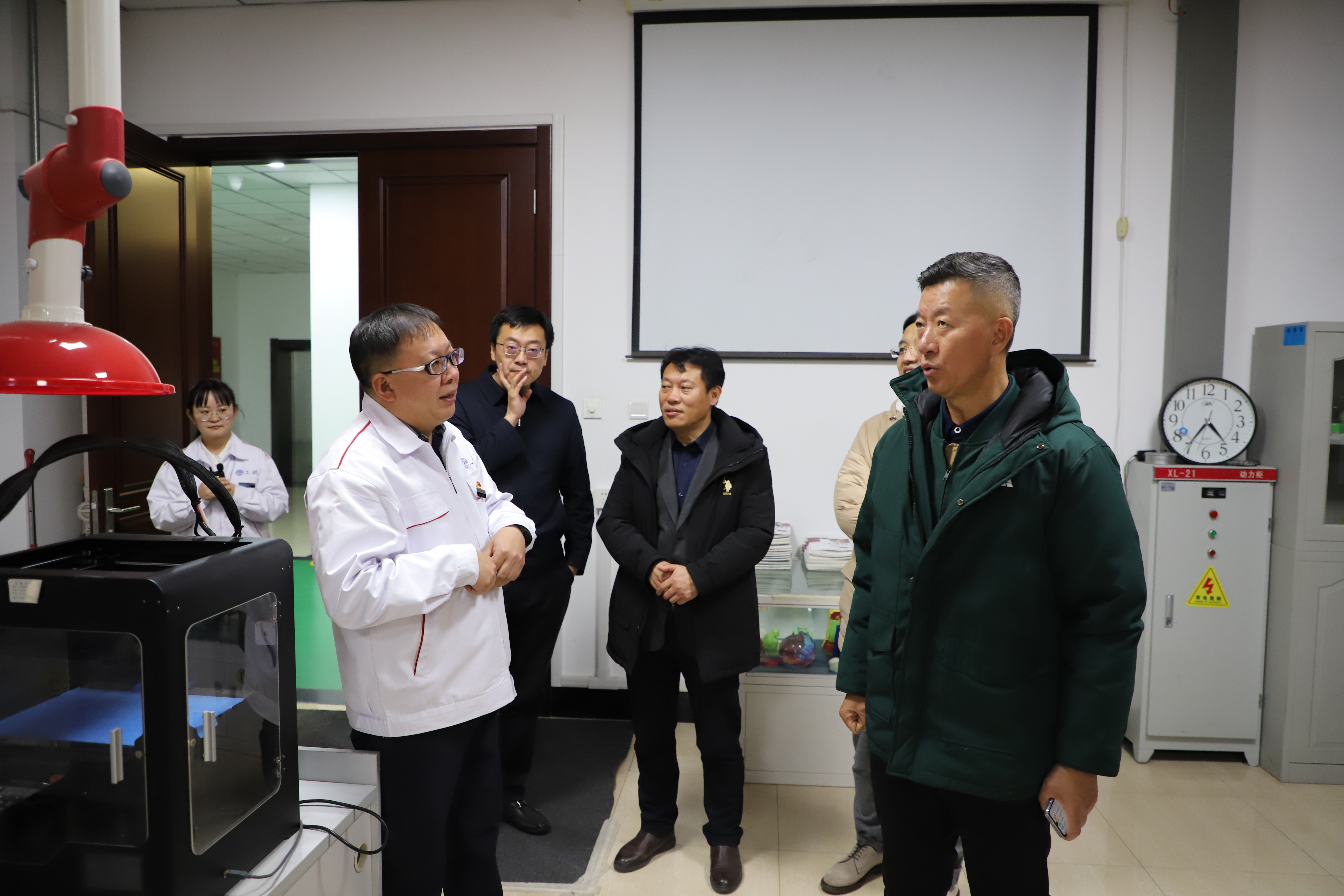 2023年11月28日下午,公司87级机械制造专业员工、理想汽车工程技术中心智能座舱总监马佳一行到工程训练中心调研交流。公司党委书记郑福胜、党委副书记丁连涛、副经理兼工程训练中心副主任刘鹏陪同调研交流。