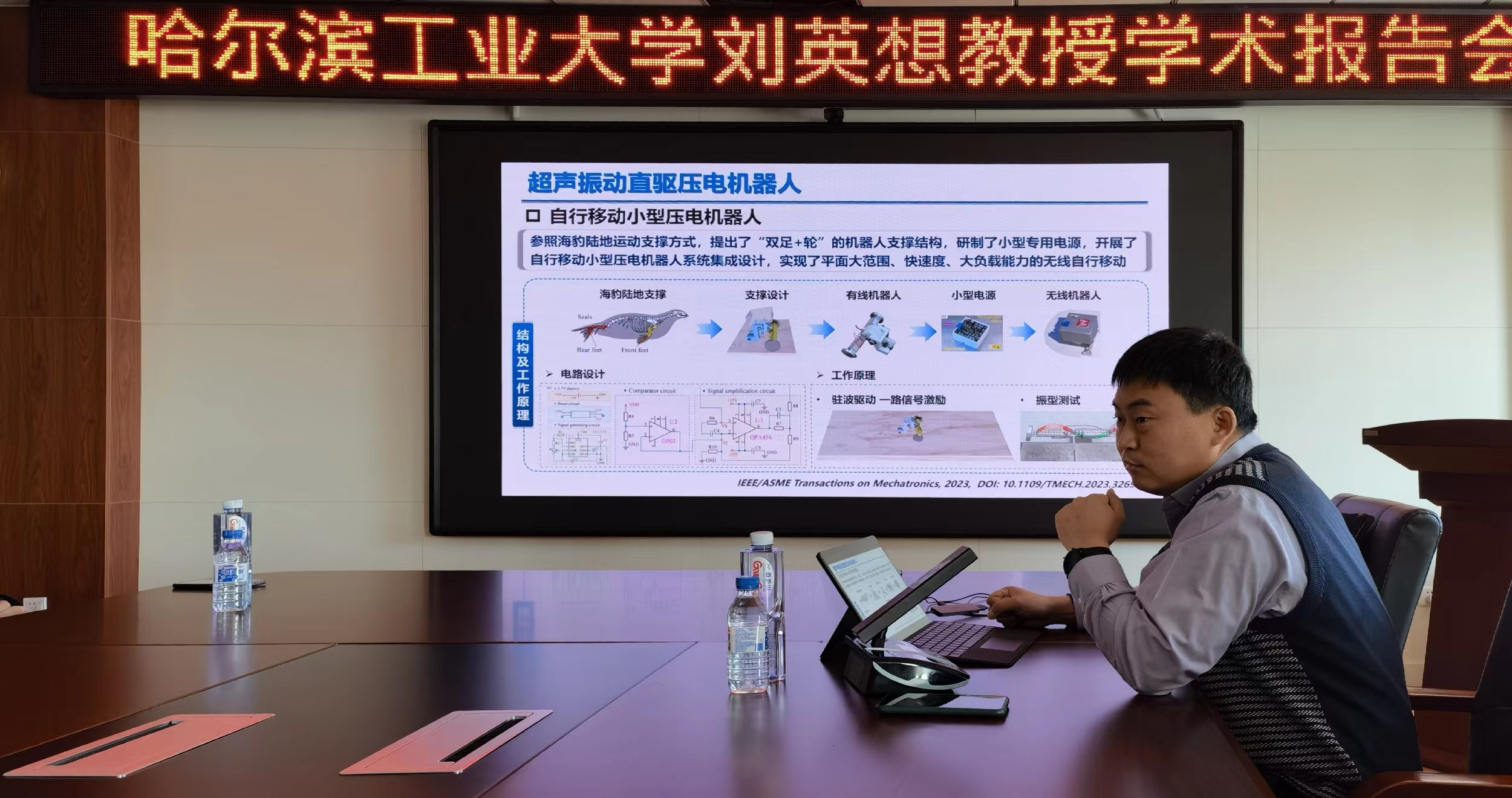 副主任黄虎教授首先致欢迎辞,并简要介绍了刘英想教授的学术成就。之后,刘教授重点从压电驱动技术概述、压电机器人探索与思考、超声振动直驱压电机器人、振动直驱地面移动机器人、振动直驱水陆两栖机器人等五个方面进行展开。他首先概述了压电驱动技术的相关研究进展,之后讲述了由压电驱动器至压电机器人再至振动直驱机器人的思考及研究历程,并详细介绍了近年来研究团队在小型机器人原理、关键科学与技术问题攻关、机器人应用等方面取得的进展,在此基础上又对团队后续研究方向与目标进行了展望。报告层次分明、内容丰富,使在场师生深受启发。