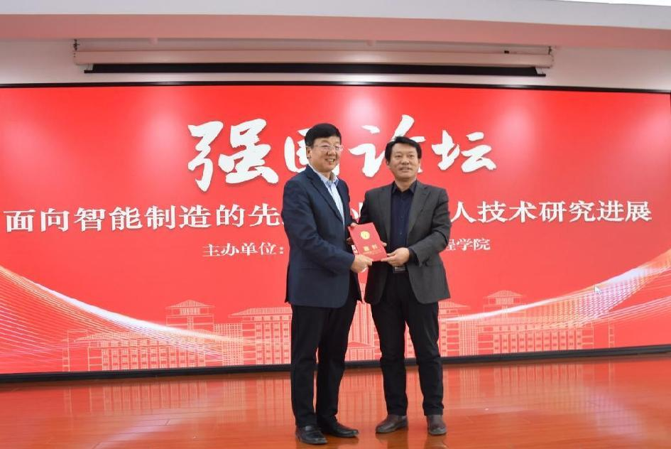 在本次论坛中,杨老师重点介绍了面向智能制造的工业机器人应用技术、协作机器人技术以及新型高速高精度并联机器人技术三个方面的研究进展。杨老师的报告深入浅出、干货满满,特别是通过应用案例的视频,生动直观地展示了工业机器人常用的应用领域和关键技术,令在场的师生受益匪浅、意犹未尽;同时,杨老师与在场师生进行了互动,耐心细致地回答了大家提出的问题;最后,公司党委书记郑福胜为杨桂林员工颁发老员工校外思政导师聘书,全体参会人员合影留念。