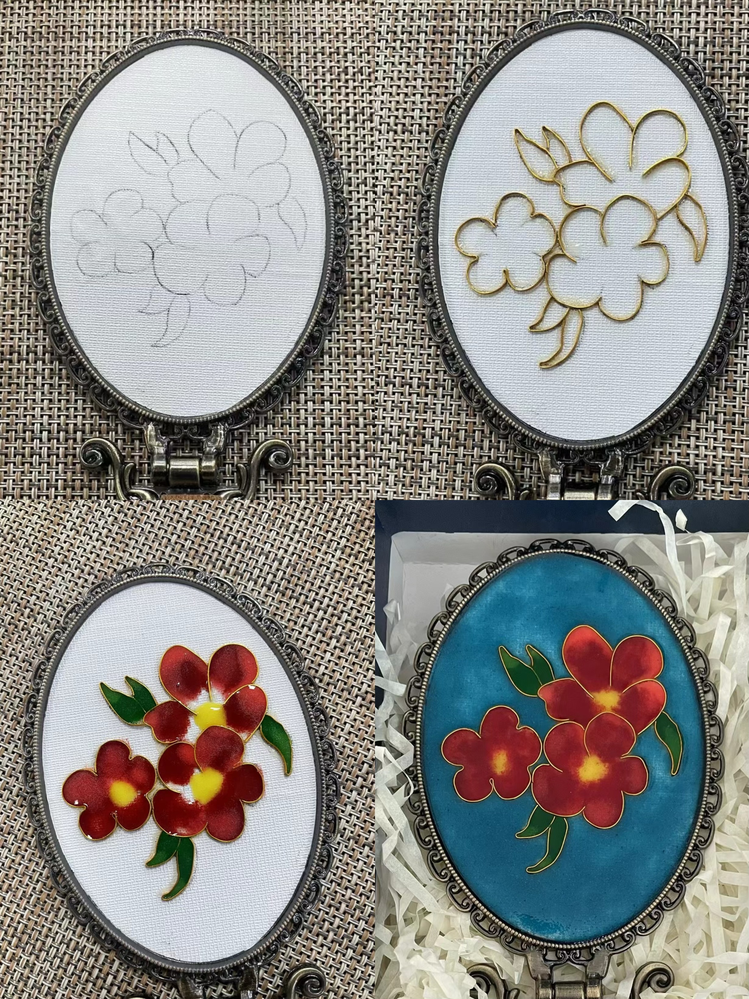 本次活动以手持铜镜为载体,融入传统绘画,邀请专业老师指导,制作专属珐琅手持镜。图案旗袍,代表邂逅古典、充满韵味的东方之美;图案凌霄花,象征向上生长、敢于做最好的自己;图案向日葵,希望向阳而生、不负时光。