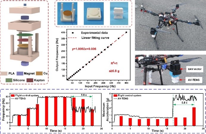论文2提出了一种基于TENG的无人机电机振动实时无线监测和预警自供电系统,设计了具有磁性弹簧结构的振动传感器(AV-TENG)用于监测无人机电机振动。实验结果表明,磁性弹簧具有良好的稳定性,AV-TENG可以实现宽频带的频率检测。该项工作构建了一个成本低廉、易于制造的信号采集系统,实现了对无人机电机振动频率和加速度的监测,实现了预警,有望推动无人机领域的发展以及摩擦纳米发电机的实际应用。