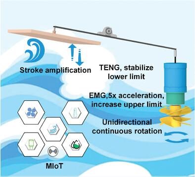 论文1提出一种用于海洋环境监测的双向旋转涡轮混合摩擦电电磁波能量收集器。该系统结合了TENG、带行星齿轮系统的电磁发电机(EMG)和驱动涡轮机,TENG和EMG组件的峰值功率输出分别为115和350 mW,功率密度为32.55和329.78 W m-3。该项工作提供了一种有效的方法来放大水波力,增强了实际海洋环境监测的能量收集能力。