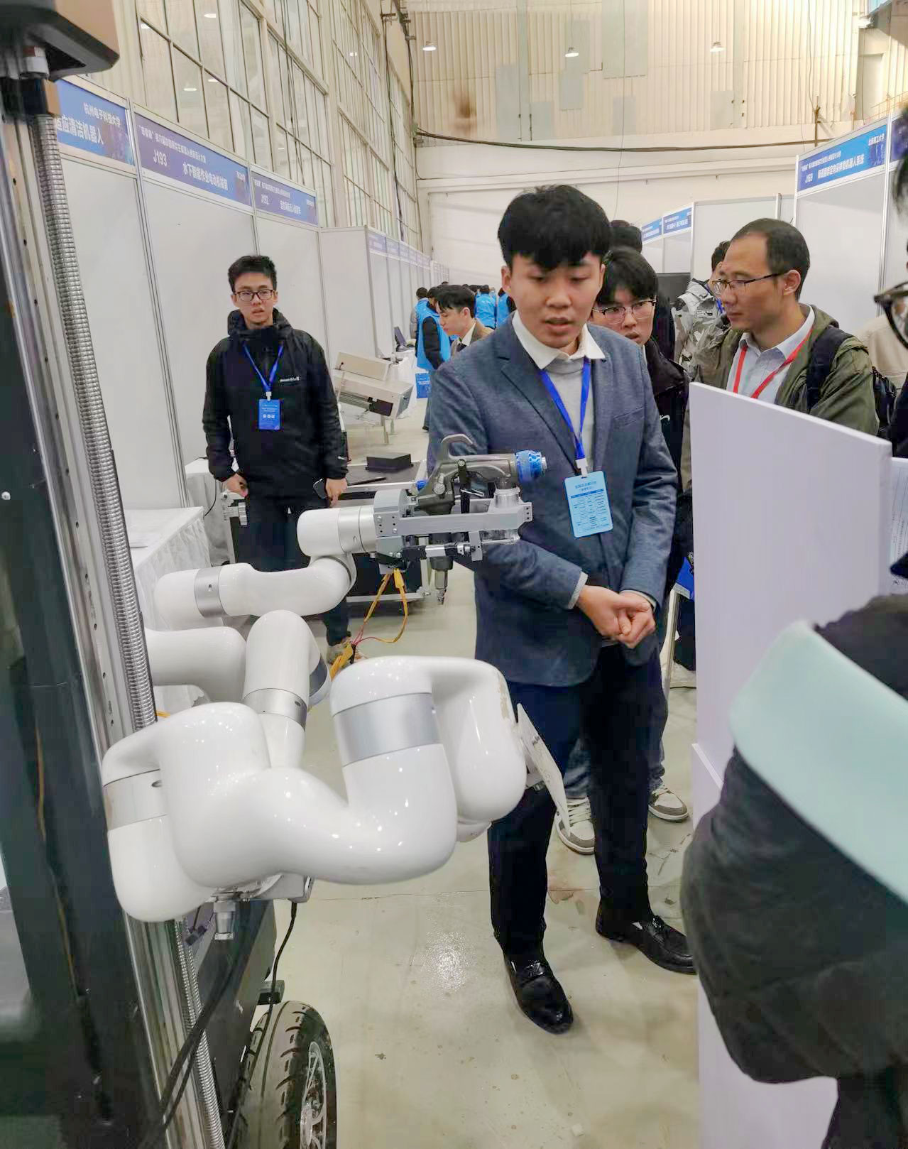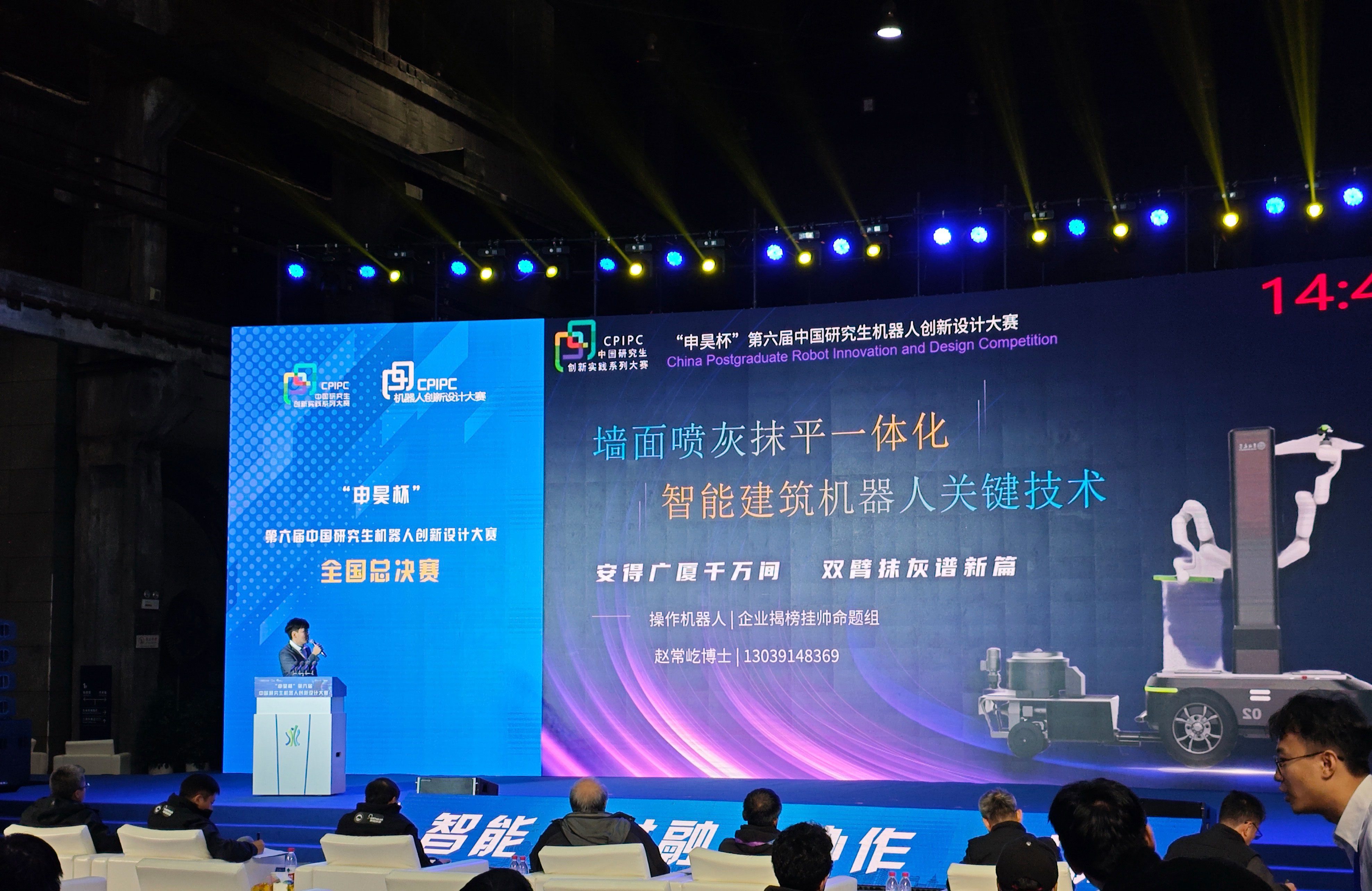 在25日上午的巡展环节,项目负责人、2023级机械博士研究生赵常屹向评委专家详细介绍了机器人系统的核心功能,并通过实物演示展示了机械臂的力位混合控制在抹灰过程中的应用,还探讨了机器人未来的应用前景,赢得了专家一致好评。其中一位专家称,该项目所展示的“墙面喷灰抹平一体化智能建筑机器人”是本次比赛中见过体量最大的机器人,技术复杂度和应用潜力均处于领先地位。