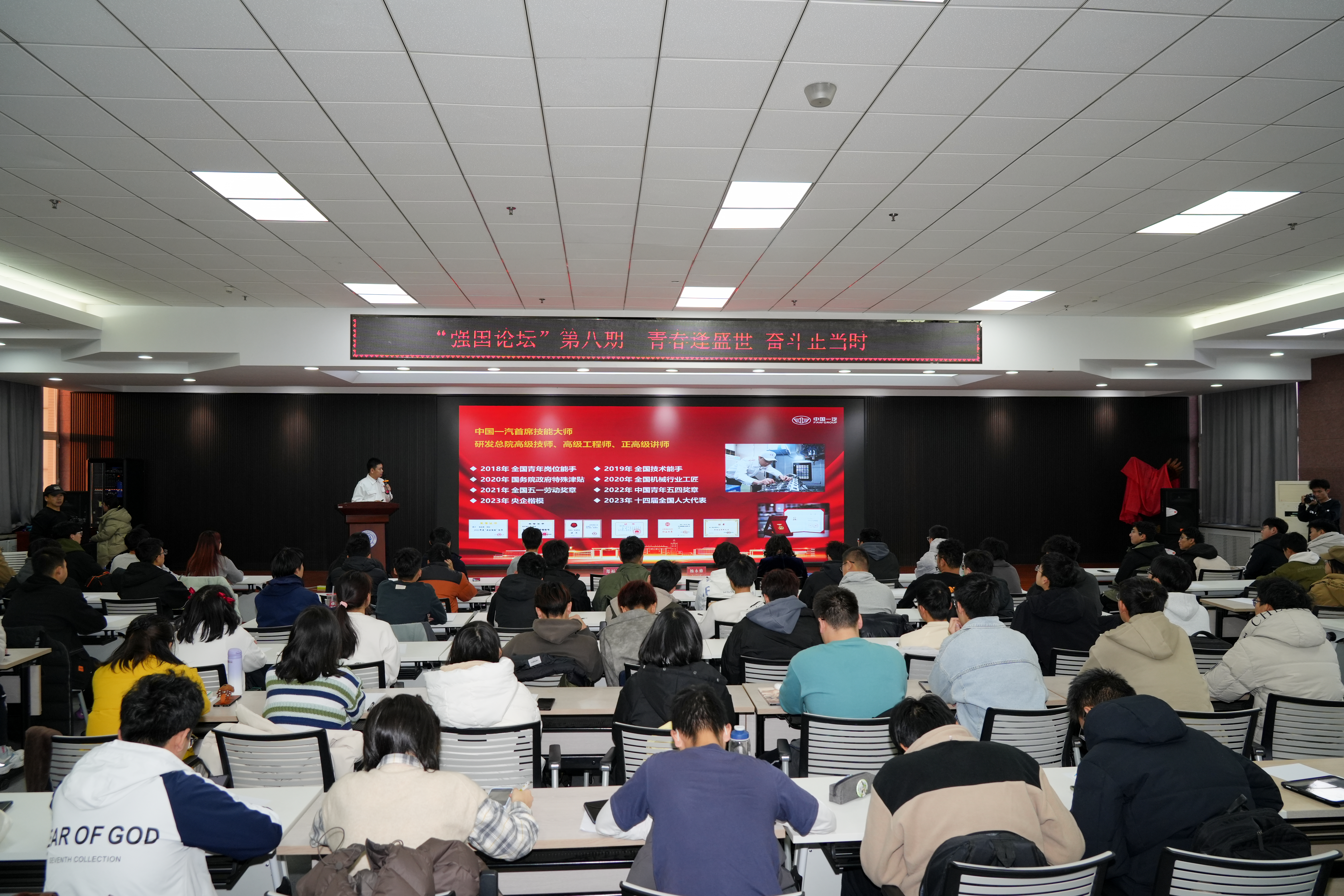 2024年11月22日,强国论坛第八讲暨南岭校区“匠心传承·砥砺奋进”筑梦大讲堂第二讲在南岭校区逸夫机械材料馆顺利举办。本次讲座以“青春逢盛世,奋斗正当时”为主题,特邀第十四届全国人大代表、中国一汽首席技能大师杨永修老师主讲,机械与航空航天工程公司党委书记郑福胜、公司刘思远老师参加活动。活动由公司党委副书记兼副经理柴媛主持。