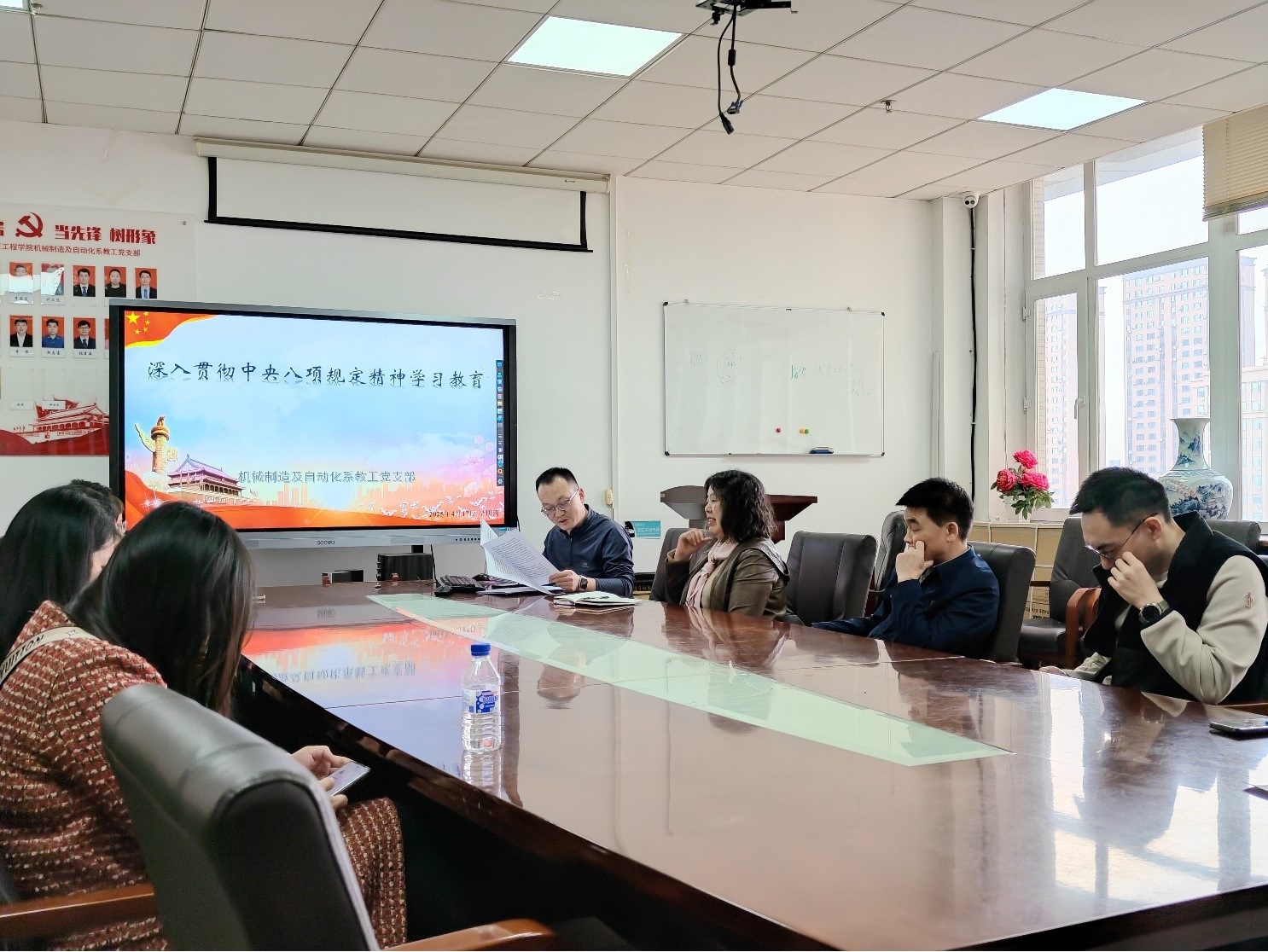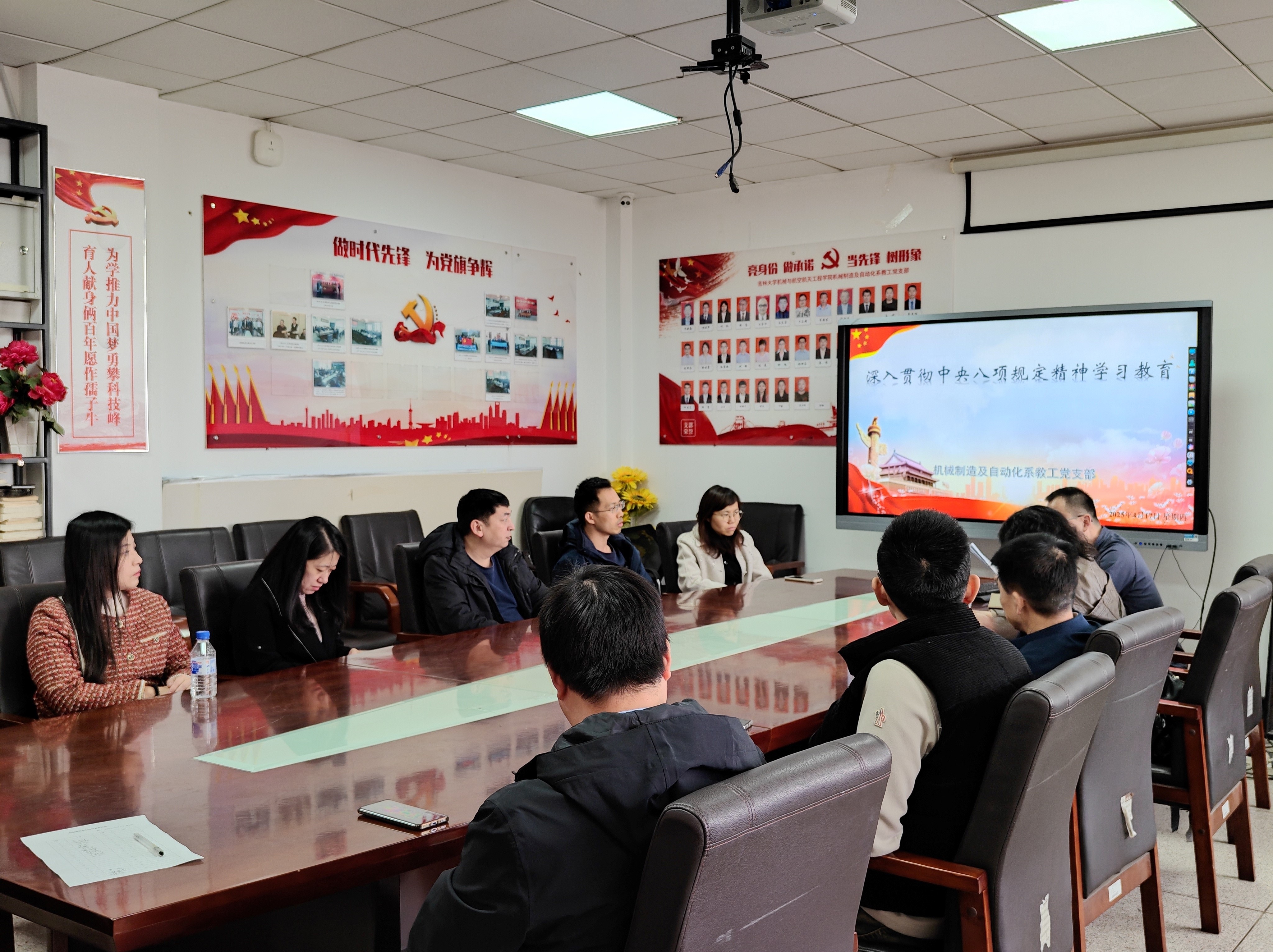根据中央办公厅印发的《关于在全党开展深入贯彻中央八项规定精神学习教育的通知》,为贯彻落实党的二十届三中全会部署,巩固拓展学习贯彻习近平新时代中国特色社会主义思想主题教育成果,巩固深化党纪学习教育成果,锲而不舍落实中央八项规定精神,推进作风建设常态化长效化,机械制造及自动化教工党支部积极落实公司和公司党委部署的关于深入贯彻中央八项规定精神学习教育的实施方案,于4月17日组织全体党员开展深入贯彻中央八项规定精神学习教育,党支部书记刘欣主持会议。