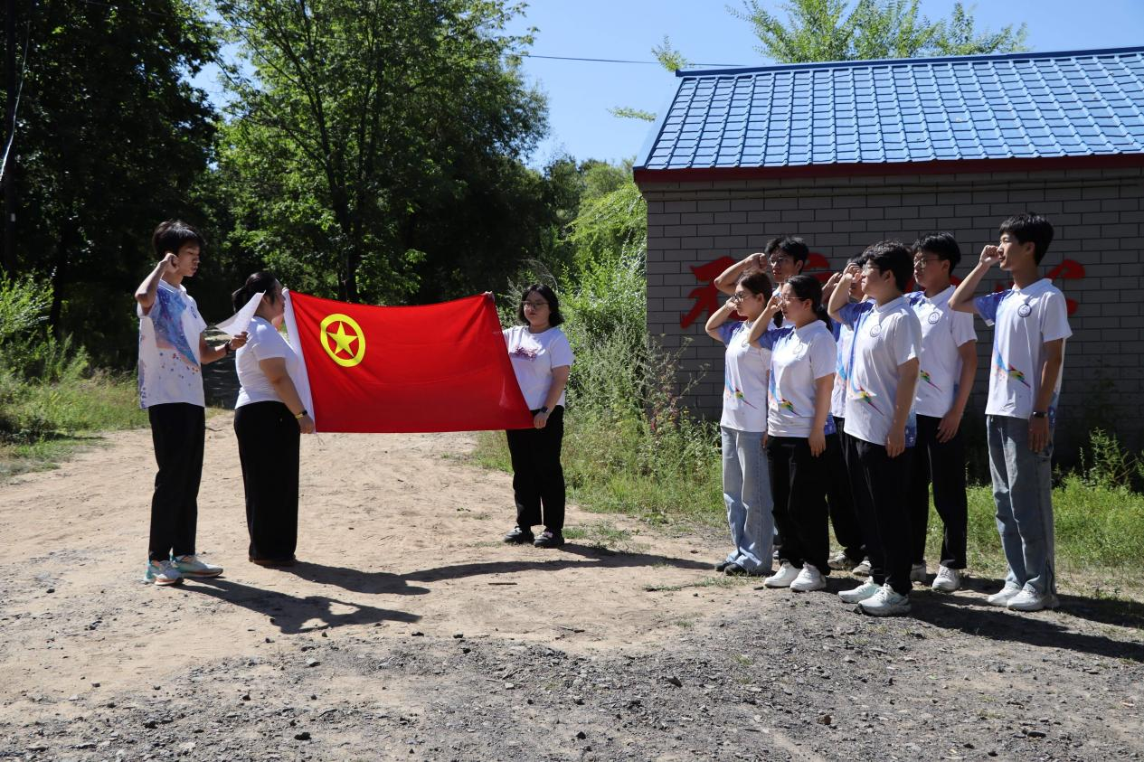 苍松掩映的遗址广场上荒草丛生,无声诉说着历史的沉重。团队在此重温入团誓词。团员们面向团旗高举右拳,庄严宣誓:“我志愿加入中国共产主义青年团……”铿锵誓言回荡在青山密林间,与80年前抗联战士的呐喊遥相呼应,将“忠诚报国、血战到底”的抗联精神注入新时代东北振兴的使命之中。