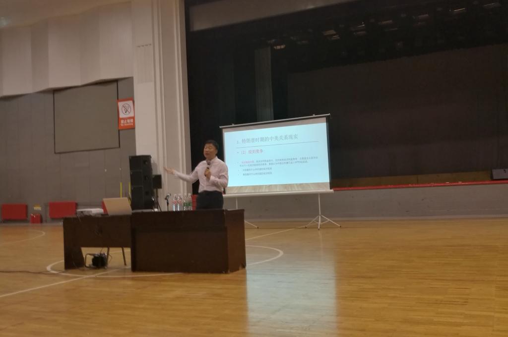 首先,于教授对到场的2018级新生表达了热烈的欢迎。随后,于教授从中美关系发展史的三个二十年说起,分析至由特朗普执政时期不太乐观的中美局势。于教授由历史引入当下,他指出,当下的中美竞争主要是实力竞争、规则竞争、领导权竞争与贸易战竞争,然而我国并不占优势,美国政府种种的对华政策一直在干预我国高速崛起,同时我国仍不是世界强国,依旧无法与美国正面打贸易战。于教授的一番话警醒了每一位新生,他们身上背负的不仅仅是个人与家庭的责任,更多的是国家振兴之责任。同时,于教授分析了当下贸易战的趋势,并为大家讲解中国的应对方法。于教授强调,中国人口基数大,人均GDP低,面对与美国的贸易战,我们应持中偏防,暂时忍受,同时加速发展国家硬实力。老员工是国家发展的中坚力量,每一位老员工都应该发挥自身价值,肩负起推动国家发展的光荣使命。会终,于教授为大家答疑,使大家进一步明确了作为老员工应担起的责任。