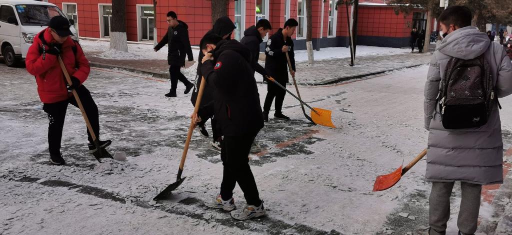 各班级接到扫雪命令后,迅速携带雪具在指定区域集合,此次扫雪活动正式开始。各班扫雪人员不畏严寒、分工明确、齐心协力、全身心地投入到扫雪工作中。虽然室外气温很低、寒风凛冽,但是同学们劳动的热情使这个冬日变得格外灿烂和温暖。同学们个个奋勇争先、热情满怀、干劲十足,忙碌的身影在皑皑白雪中构成了一道亮丽的风景线。在赵帝老师和各班班长的带领下,各位同学发扬吃苦耐劳、顽强拼搏的精神。扫雪期间,大家团结协作,顶着寒风高效快速地将各自分担区的积雪清扫干净,经过一个半小时的奋战,此次扫雪任务圆满完成。校区主干道又恢复了往日的畅通洁净,重新变得畅通无阻。