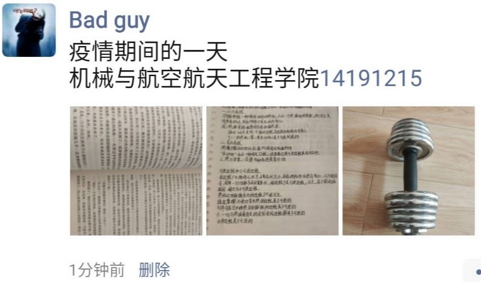 活动分两部分。一是以腾讯会议为平台,各班团支书组织开展了云班会,全班共同观看了“武汉抗疫记”、“中国抗疫长卷”等视频。 班内志愿者同学讲述了自身抗疫志愿过程中的小故事,此外,同学们自行交流分享了抗疫期间的心得。二是以“疫情期间的一天”为主题,大家分享了居家一天的活动并进行了打卡,内容主要是围绕“停课不停学,居家学习不放松”、“全民运动,居家锻炼小能手”、“美食传温情,居家厨艺大比拼”三方面。活动结束后,每位同学还写了自己的心得体会,此外,各班团支书将活动内容制作成微信推送分享到朋友圈,班内同学也将其转发。活动圆满结束。