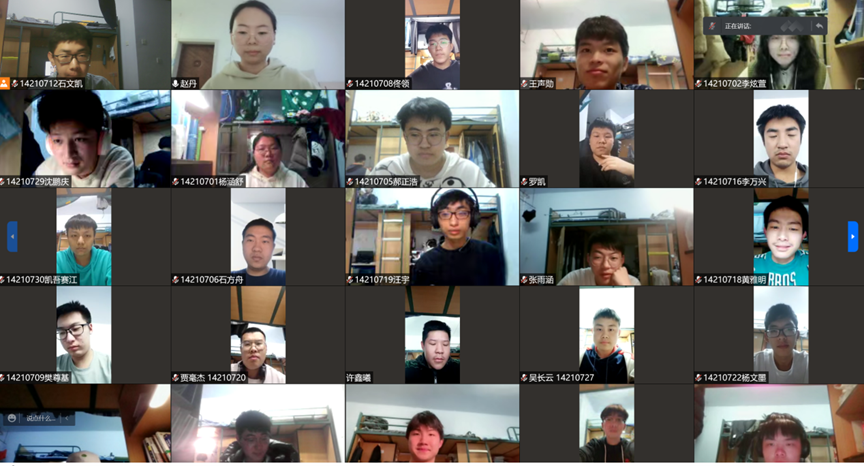 首先,班长石文凯同学热情邀请全班同学开启摄像头,面对面交流,并做了开场发言,就疫情的防控情况和物资的配送状况做了简要说明,对被封在寝室的同学们进行安慰。发言最后,邀请团支书为班级同学加油打气。