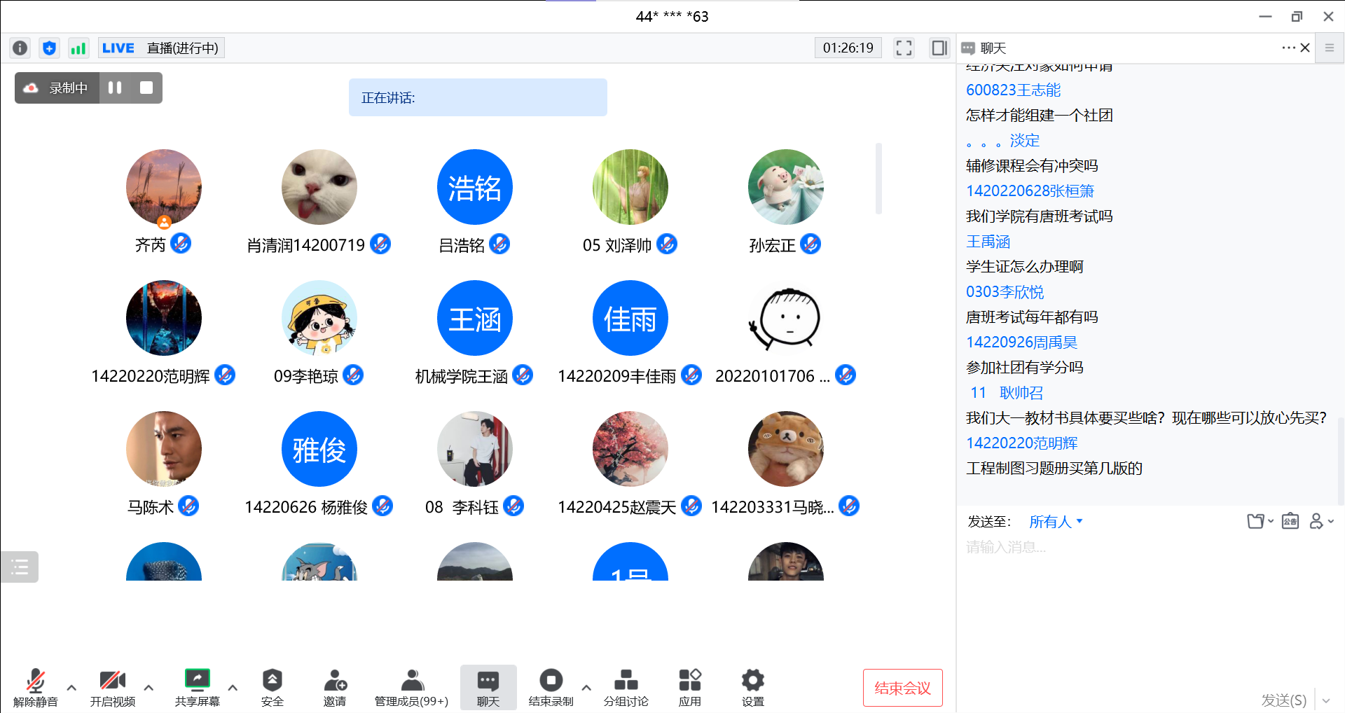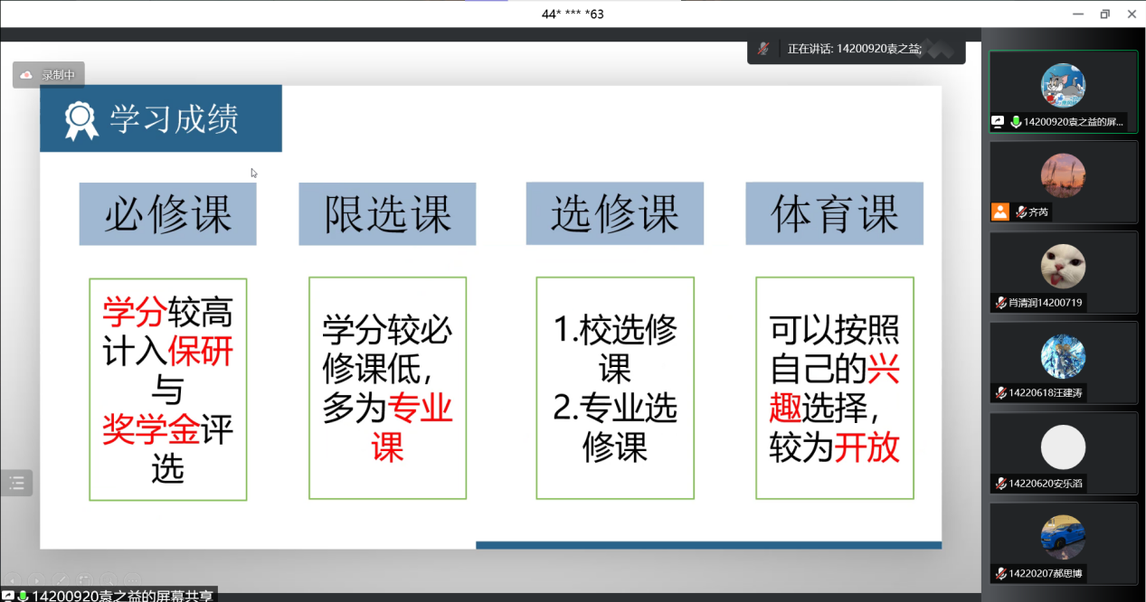 首先,肖清润学长对刚入学的同学们表示了热烈的欢迎,对专业进行了较为的介绍,并针对新同学未来学习生活中可能遇到的问题结合自身经验给出了许多建议。袁之益学长分享了很多学习心得,在绩点计算、课程分布、科研竞赛等方面进行了讲解。孙宏正学长在强调了学习的重要性后,鼓励新同学们积极参与各项活动,多方面展现自我风采。分享过程中,新同学们纷纷表示了对未来生活的憧憬,竞相提问,十分活跃,代班们一一耐心解答,干货满满,令与会同学对未来的学习生活有了更深的了解。虽然因疫情原因无法面对面交流,但与会同学依旧积极配合,参与互动,在热烈而欢快的氛围中,本次交流分享会圆满结束。