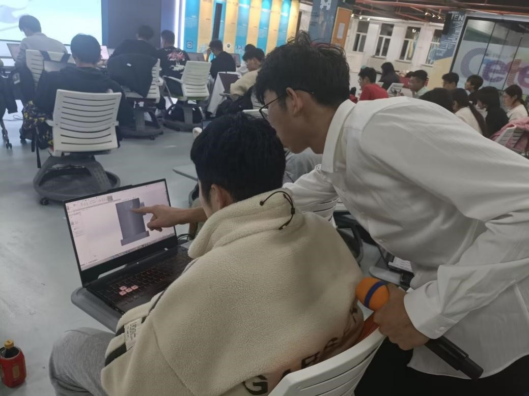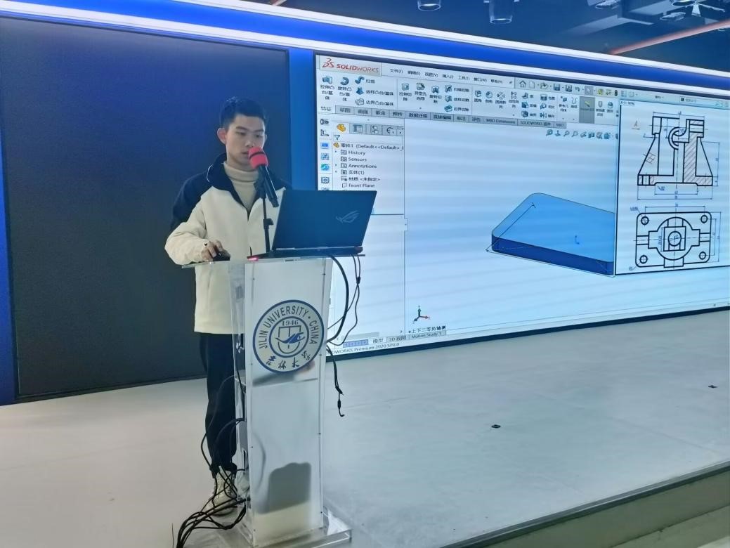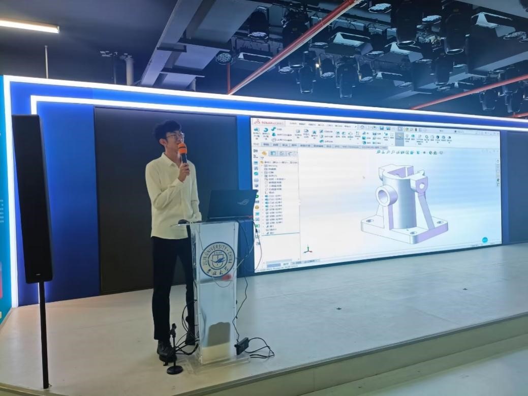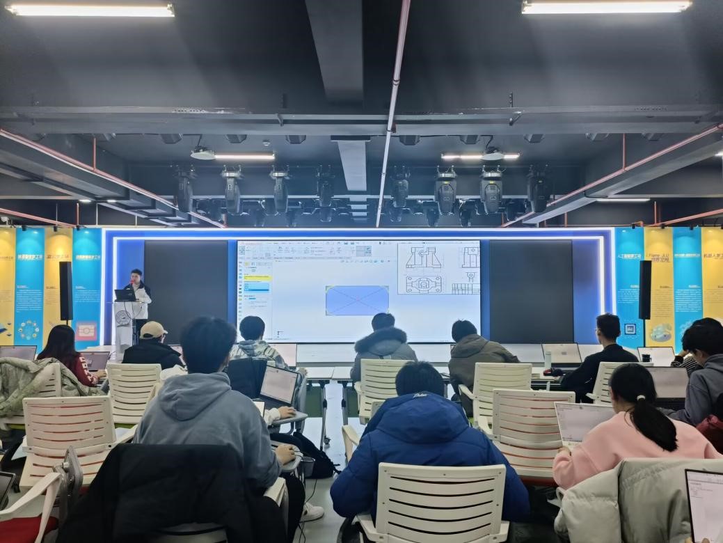 首先,钟振宇同学和黄雅明同学向大家进一步介绍了SolidWorks软件的常用命令,并带领大家完成了一张零件图的建模绘制。两位同学指出,软件的学习需要在不断地练习当中积累经验,摸索出最适合自己的方法,希望同学们可以勤加练习,熟能生巧,提高制图速度,以便在各项建模比赛中取得更好的成绩。