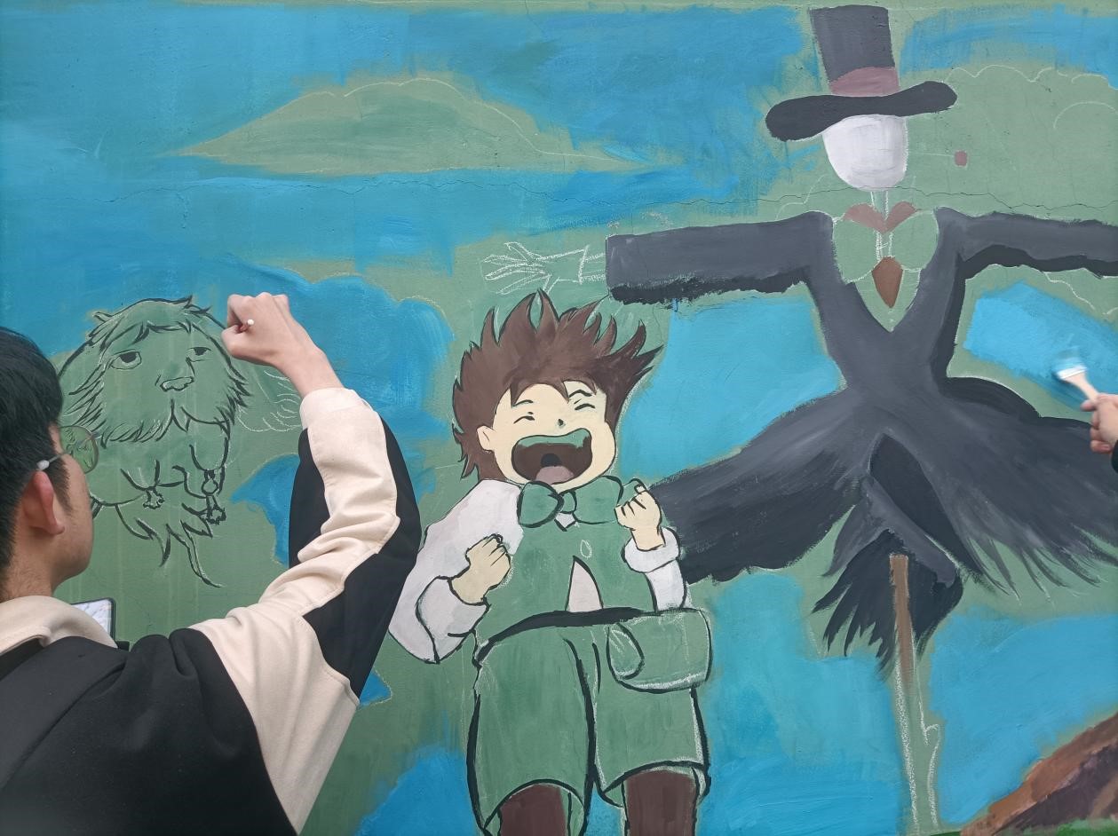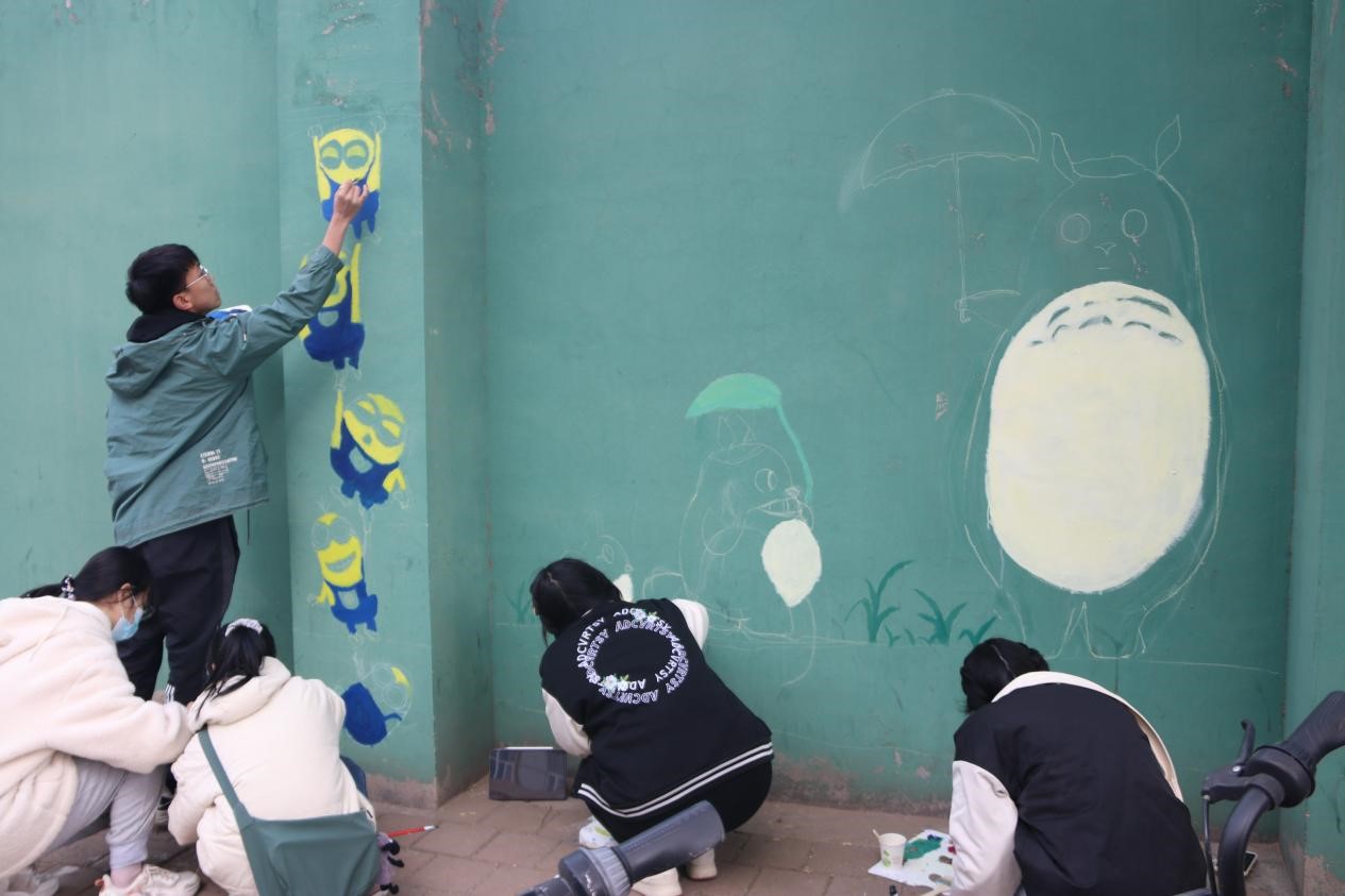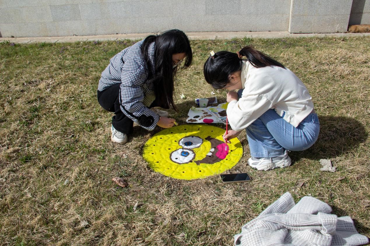 在南岭校区的机械馆门前、杏花大道、十二公寓楼下和二餐门前,同学们调制好颜料,先用粉笔勾勒线条,再用颜料填涂,在墙体和井盖上绘制了一幅幅活泼生动的图案。这些图案中既有哆啦A梦、海绵宝宝等一些家喻户晓的动画角色,又有各式各样的风景图、建筑图,让普通的墙面和井盖华丽变身。活动中,两校同学集思广益,充分发挥想象力与创造力,一笔一画将心中的色彩绘制在校园,彩绘整体风格轻松明亮,丰富有趣,让昔日单调的墙面和地面,穿上了崭新的外衣。他们尽情挥舞着手中的画笔,一幅幅生动有趣的图画出现在同学们面前,引得过往师生驻足观看、拍照打卡。
