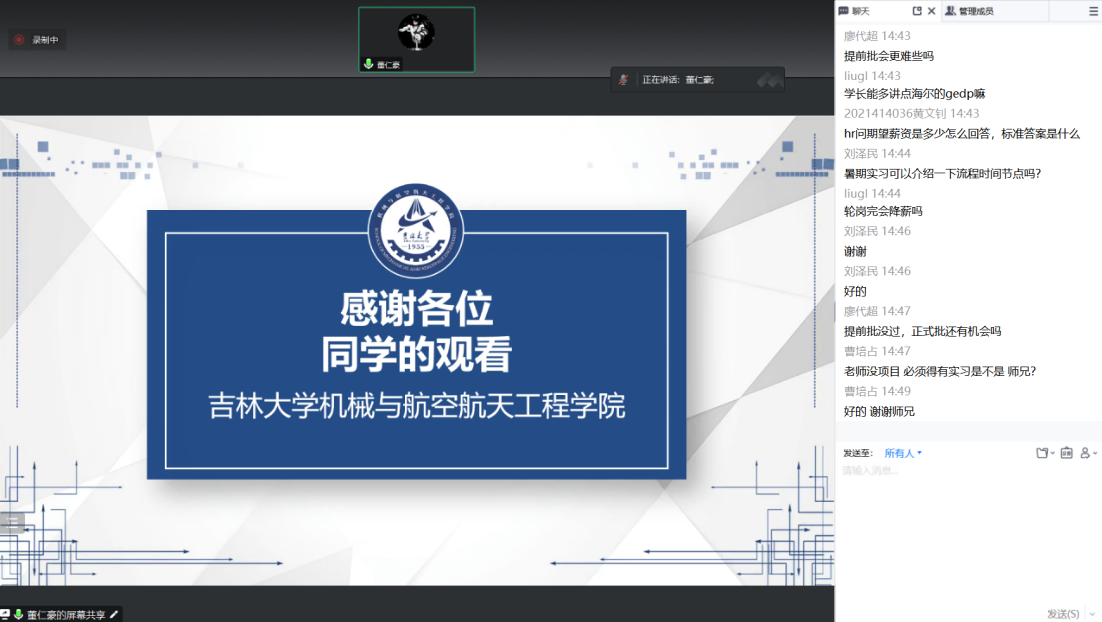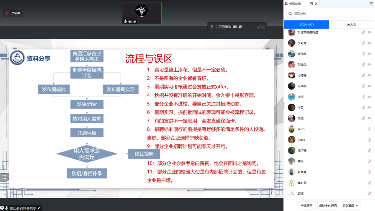 本期分享会邀请了20级硕士董仁豪为大家分享就业经验。董仁豪,担任特斯拉校园KOL、海尔未来规划局成员、百度校园大使、三一集团校园大使和蔚来汽车校园大使等。本次会议董仁豪从简历制作与常见问题、面试经验、找工作流程及误区等几个方面展开分享。