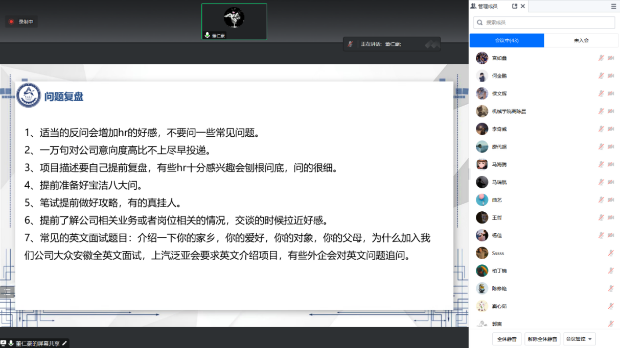 董仁豪从简历框架讲起,对基本信息、工作经历和证书技能等方面所占的比重进行了详细的分析,针对简历常见问题,列举了8个注意事项,并对每一项可能遇到的问题进行讲述。董仁豪为大家传授了一些面试经验,其中强调了问题复盘,并对同学们提出了建议,一是不能局限于传统行业,二是多关注暑期实习转正率问题,三是注意积累信息渠道,尽量从不同渠道获取招聘信息。最后董仁豪结合本次分享内容讲述了自己的就业经历,其中包括了简历展示、总体面试问题及英文面试问题,同时为大家分享了自己在就业期间整理的资料,包括书籍、软件、企业及年报等。
