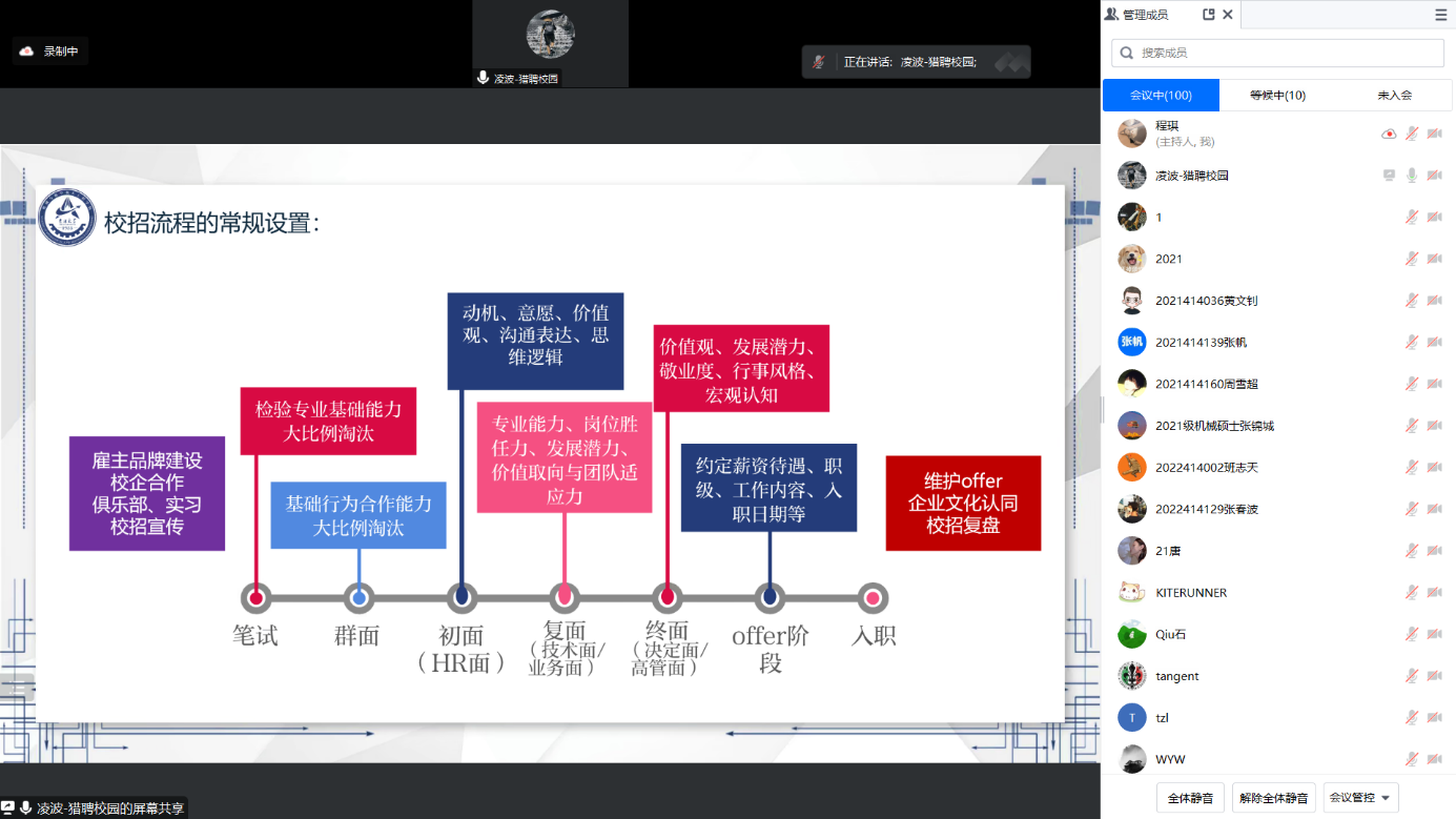 本期分享会邀请了猎聘校园–高校关系总监凌波为大家分享就业经验。凌波,猎聘校园–高校关系总监,复旦、南大、哈工大、南开、北航、北工大等高校就业指导活动校外讲师;教育部24365联合招聘活动猎聘方发起人;人社部湖北高校毕业生就业指导特约讲师。曾负责众多企业校园招聘落地工作,参与策划全国老员工最佳雇主评选活动,多次牵头举办公益活动。本次会议凌波老师从第三方更专业的角度为大家分享各阶段面试差异与表现技巧。