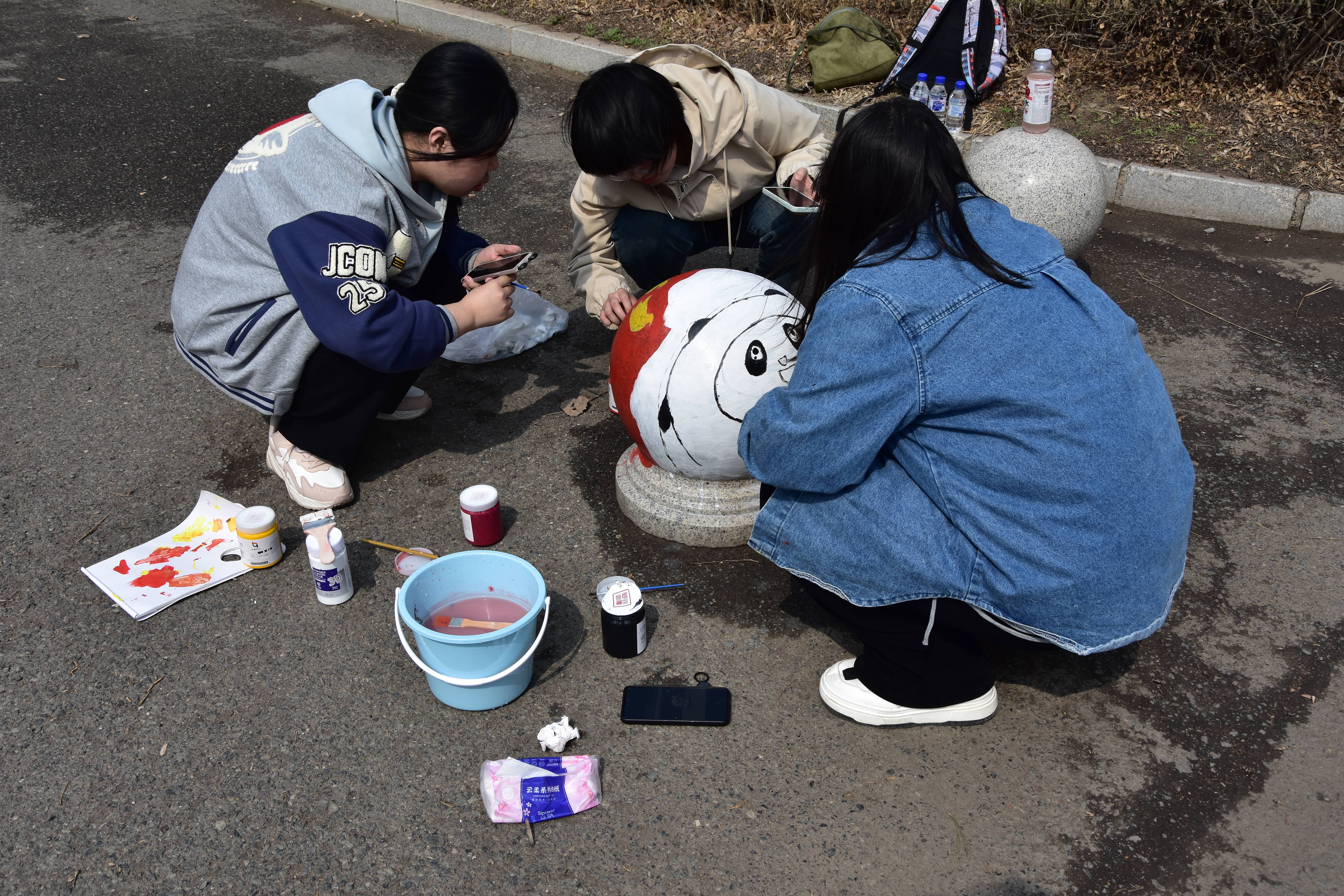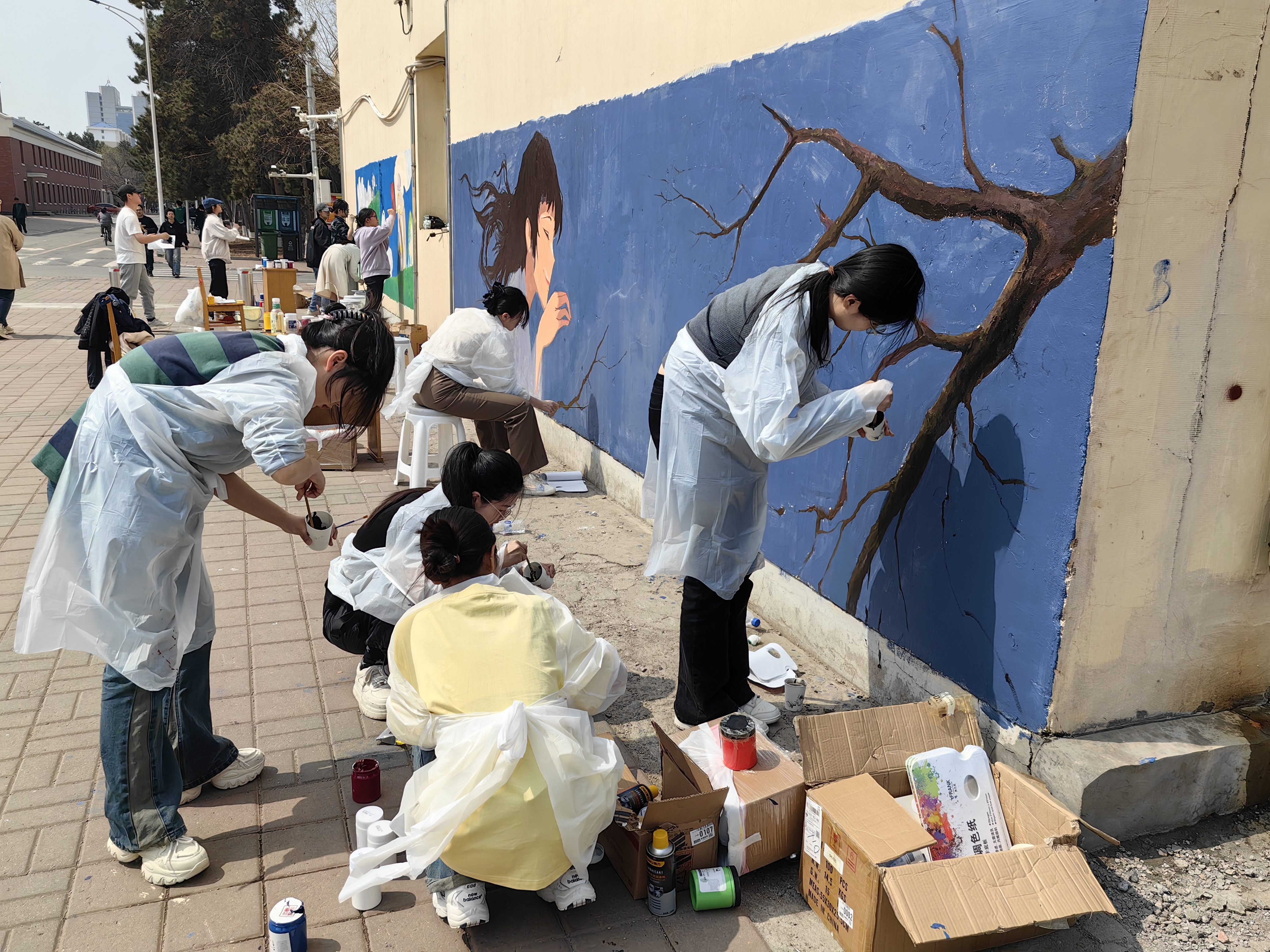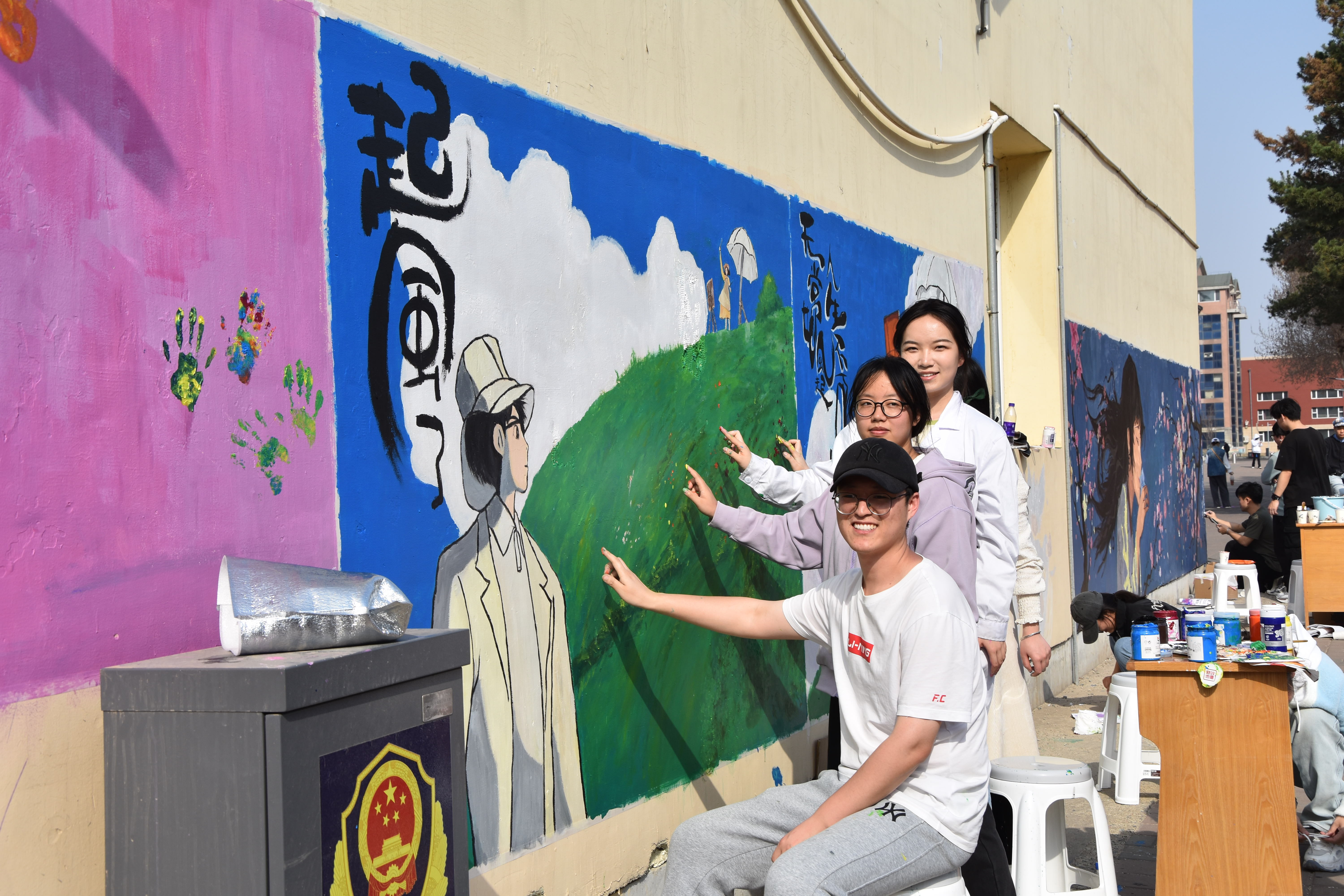 活动中,两公司志愿者同学、峰昀刀笔油画社成员共同在篮球场、南岭校区十公寓、杏花大道的墙面、井盖、石墩上绘制作品,各种色彩在调色盘上不断变换,在笔尖上灵活游走,又在墙面、地面慢慢浮现。绚烂的彩绘、明媚的春光、洋溢笑容的青春面庞在大公司园里相映成趣。