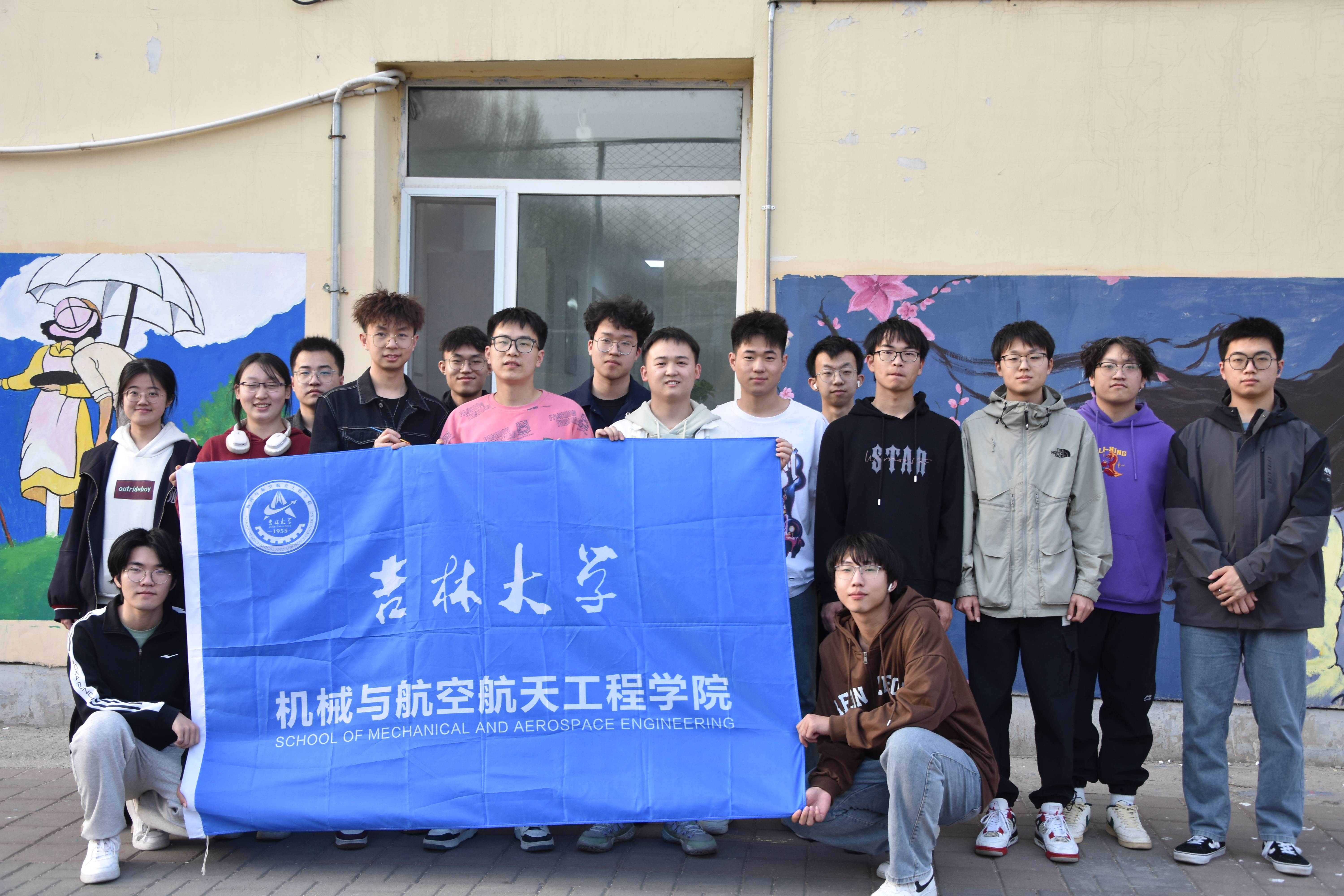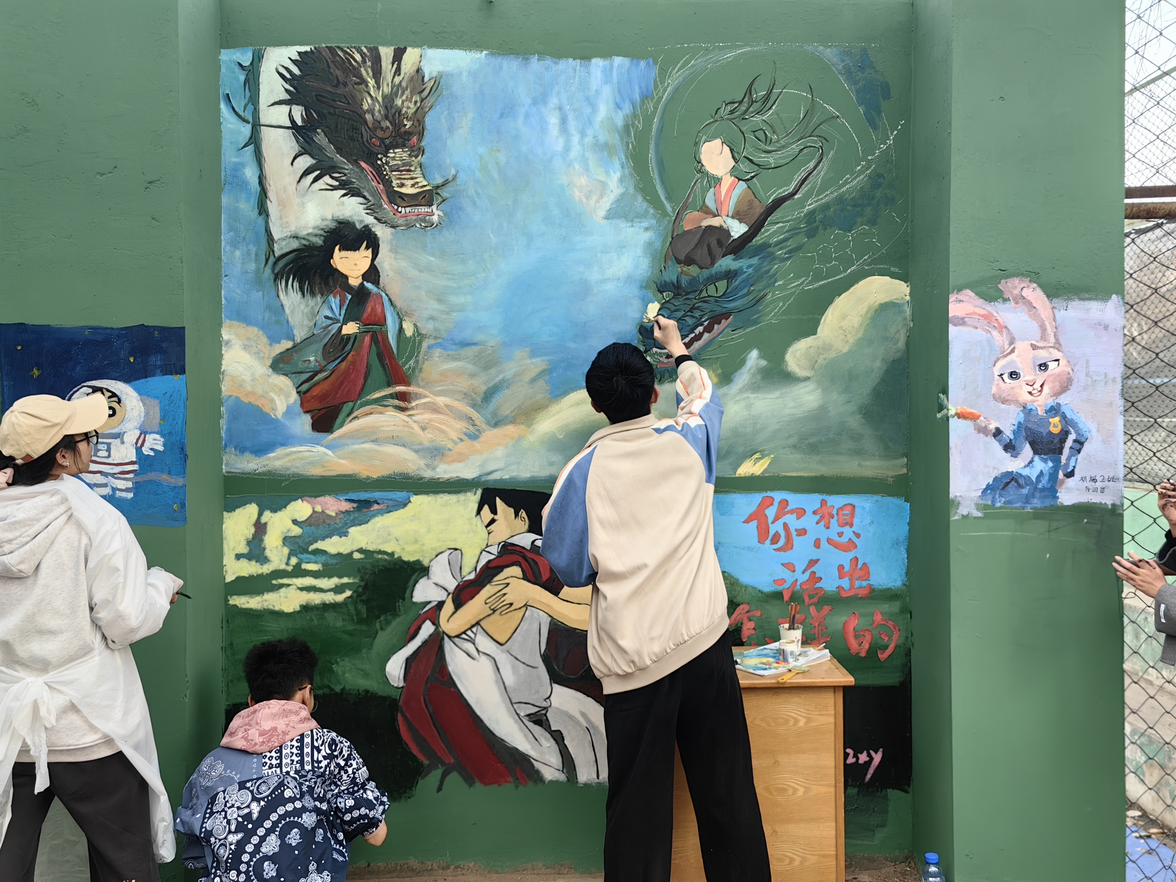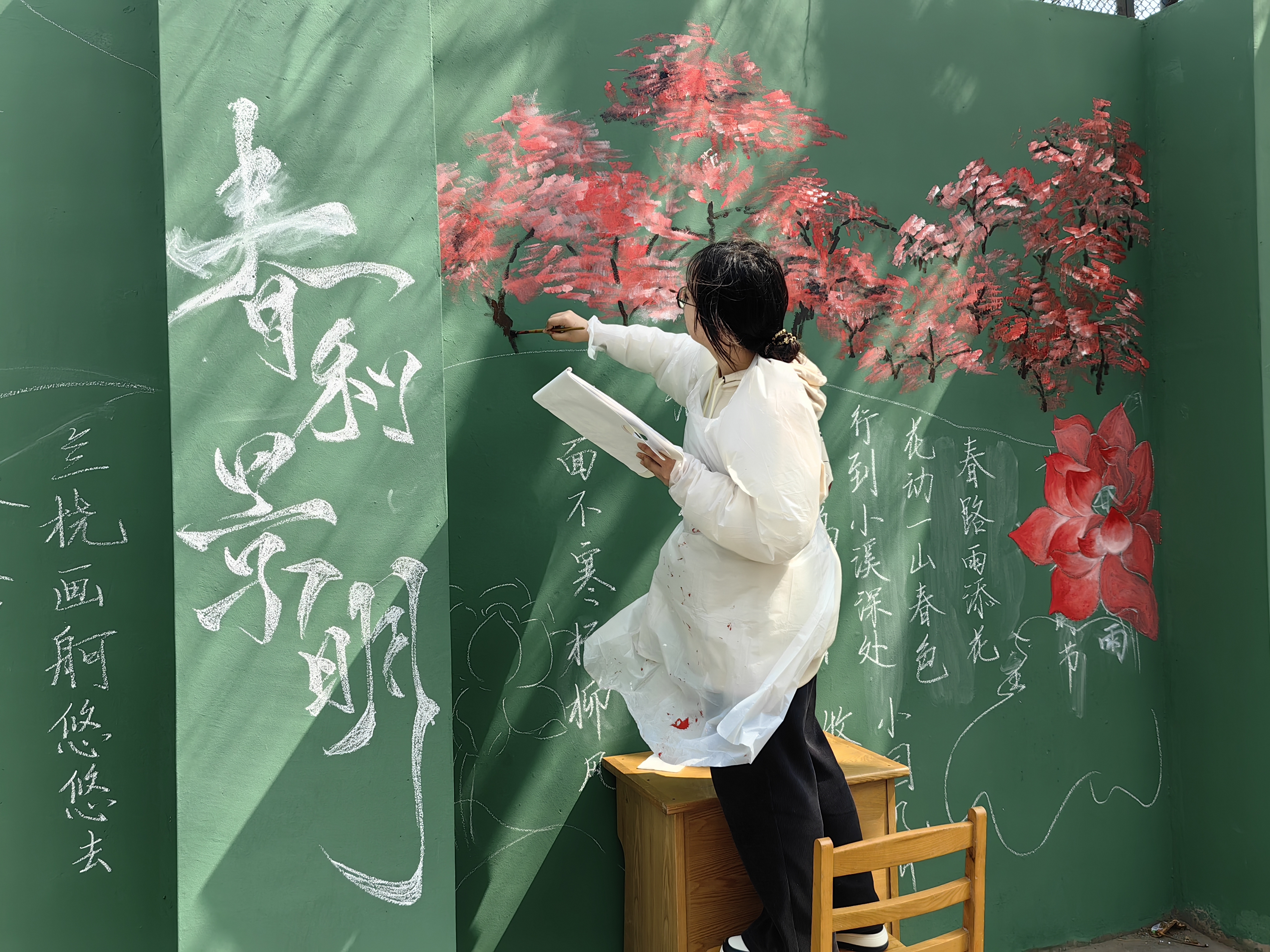 活动中,两公司志愿者同学、峰昀刀笔油画社成员共同在篮球场、南岭校区十公寓、杏花大道的墙面、井盖、石墩上绘制作品,各种色彩在调色盘上不断变换,在笔尖上灵活游走,又在墙面、地面慢慢浮现。绚烂的彩绘、明媚的春光、洋溢笑容的青春面庞在大公司园里相映成趣。