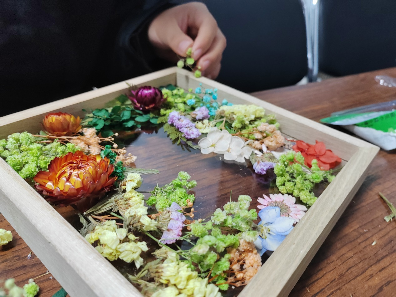 活动开始前,活动负责人从材料、工具及制作流程,从构图、搭配、粘贴及制作细节等方面进行了详细讲解,指导大家如何做出精美的干花相框。活动开始后,同学们充分发挥自己的想象力,巧妙地利用色彩鲜艳的干花,搭配上各式各样的相框,将干花错落有致地粘贴在透明的玻璃瓶内,共同创造出一系列既富有创意又满载情感的精美摆件。