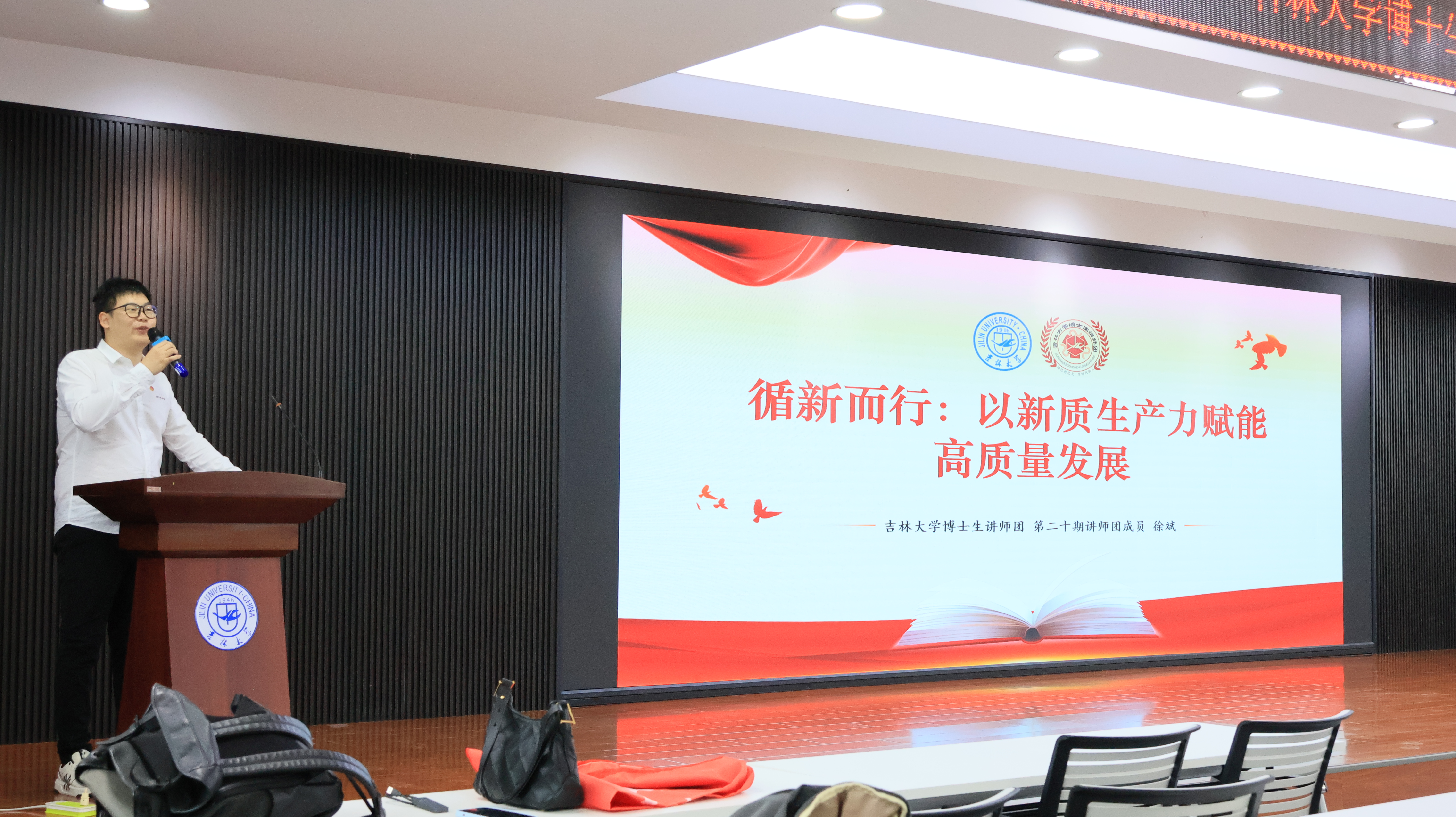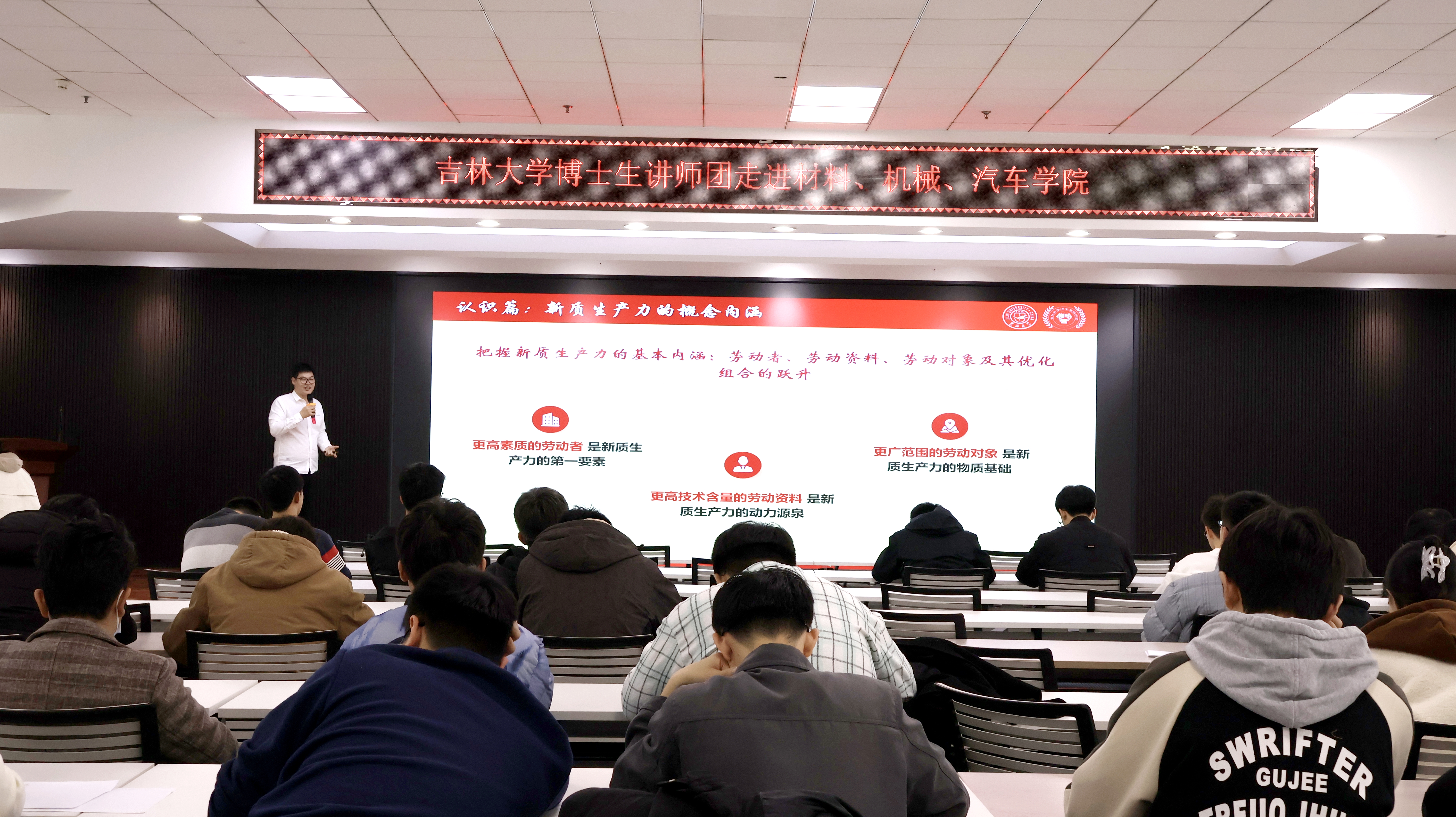 在宣讲中,博士生讲师团徐斌对“新质生产力”的概念进行了详细阐述。他强调,新质生产力强调创新驱动、绿色发展以及智能化转型,这不仅是企业提升竞争力的关键,也是国家经济实现高质量发展的基础。徐斌指出,在当前的数字化、智能化浪潮中,企业和国家必须通过不断创新和技术升级来提升自身的竞争力。徐斌还结合经济学的例子为工科研究生提供了崭新的视角,激励他们在未来的学习工作中勇于探索、积极创新。在当前快速变化的时代,同学们不仅要掌握扎实的专业知识,更要具备应对挑战的能力和跨学科综合能力。