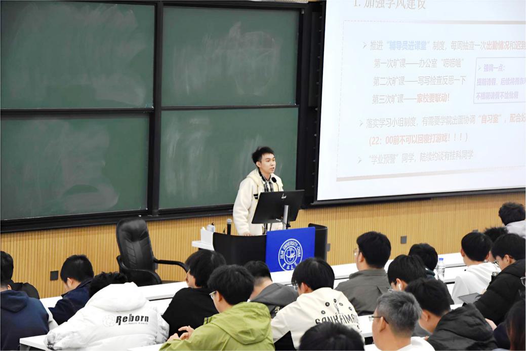 接着,由范宝元老师召开年级大会。首先,范老师要求全体员工应加强学风建设,推进“辅导员进课堂”制度,完善学习小组建设,加强对同学们自习的管理。其次,大会强调应加强寝室管理,做到无违章电器和加强卫生清扫,提高寝室检查频率。同时,范宝元老师高度关注同学们的生活状态,鼓励同学们与他人积极沟通。随后,范老师对同学们假期安全与防骗防诈等方面进行了温馨的提醒。最后,范老师向同学们展示了部分有关bevictor伟德学士学位授予的相关细则,叮嘱同学们认真学习,不要违反校纪。