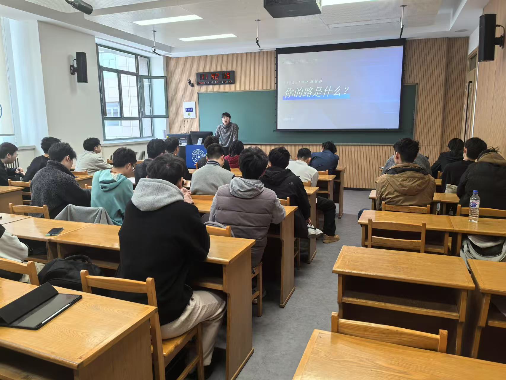 142221班班会上,班长李壮志以“你的路是什么”为班会主题,分享自己在大学三年求学之路上的一些个人见解,同学们也根据班会主题分享自己的观点和想法,现场讨论热烈。