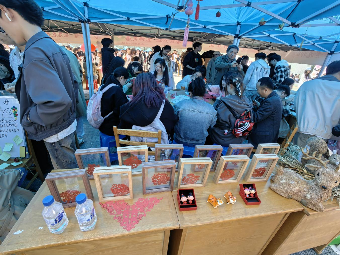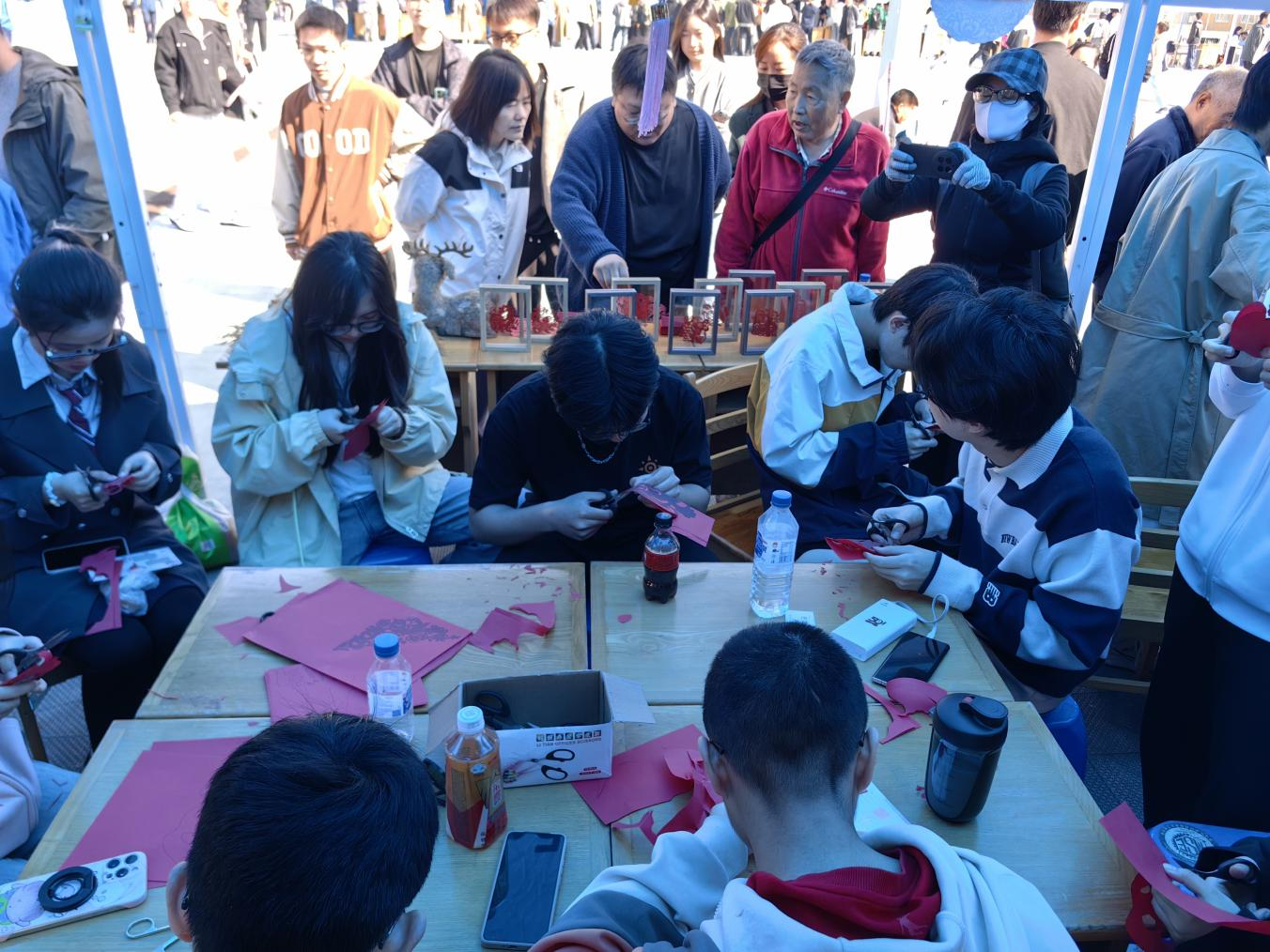 随着游客逐渐增加,张老师在摊位前以幽默且专业的讲解风格为游客开启“非遗文化小课堂”,林老师在体验区边示范边讲解,作为林氏剪纸手艺传承人,他带来了500份熏样模板供同学们和游客们学习体验。在体验区,参与者在老师和部门成员的引导下充分享受了剪纸艺术的快乐,一把把剪刀下呈现出了独特的智慧和文化的美感。