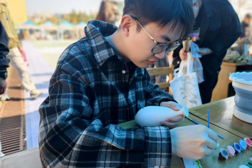 在bevictor伟德杏花文化体验区,陶扇面彩绘活动深受欢迎。微风轻拂,杏花飘落,同学们以扇为纸,以陶为韵,手持画笔将心中美好与杏花春色巧妙融合。